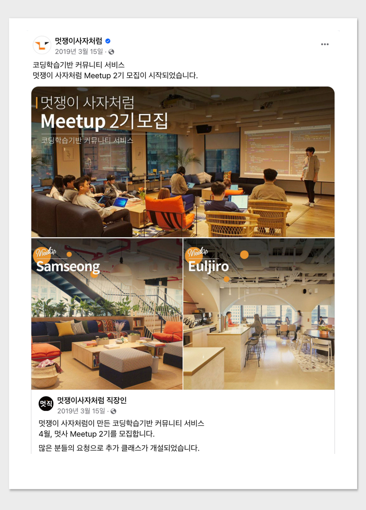 다양한 커뮤니티 행사, 독서 모임이 열리고 있는 시기였기에 우리는 멋쟁이사자처럼 Meetup이라는 이름으로 직장인 수업을 시도해 보기로 했다. 노코드 플랫폼 노션으로 가볍게 페이지를 만들고, 구글의 설문지 툴을 활용하여 강의를 듣고 싶은 사람들의 리드를 수집했다. 팀원들과 우리가 생각하는 강의 환경의 모습을 촬영하고 바로 광고를 집행했다. 가볍게 시작한 수업은 다양한 경험을 통해 점차 진화되었고 멋쟁이사자처럼 직장인이라는 수업으로 멋쟁이사자처럼의 B2C 사업으로 자리 잡았다.