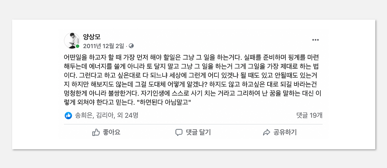 저는 목표를 달성하고자 할 때 [선언하기]와 [일단하기] 두 가지 행동을 합니다. (지금 생각해보니 너무나도 꾸준히 ENFP 스러운 사람) 생각해보면 결국 두 행동들이 스스로를 오래된 꿈으로 다가가게 하게 하는 중요한 원동력이었던 것 같습니다.