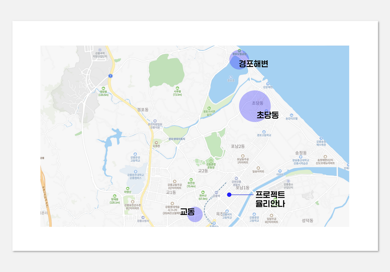 프로젝트 율리안나를 시작해야겠다고 다짐한 이유는 소중한 사람들과 함께하는 현재의 시간을 만들기 위해서였습니다. 소중한 사람들이 프로젝트 율리안나에 최대한 접근하기 쉽도록 강릉역 혹은 강릉 시외버스터미널에서 그리 멀지 않은 공간이길 바랐었죠.