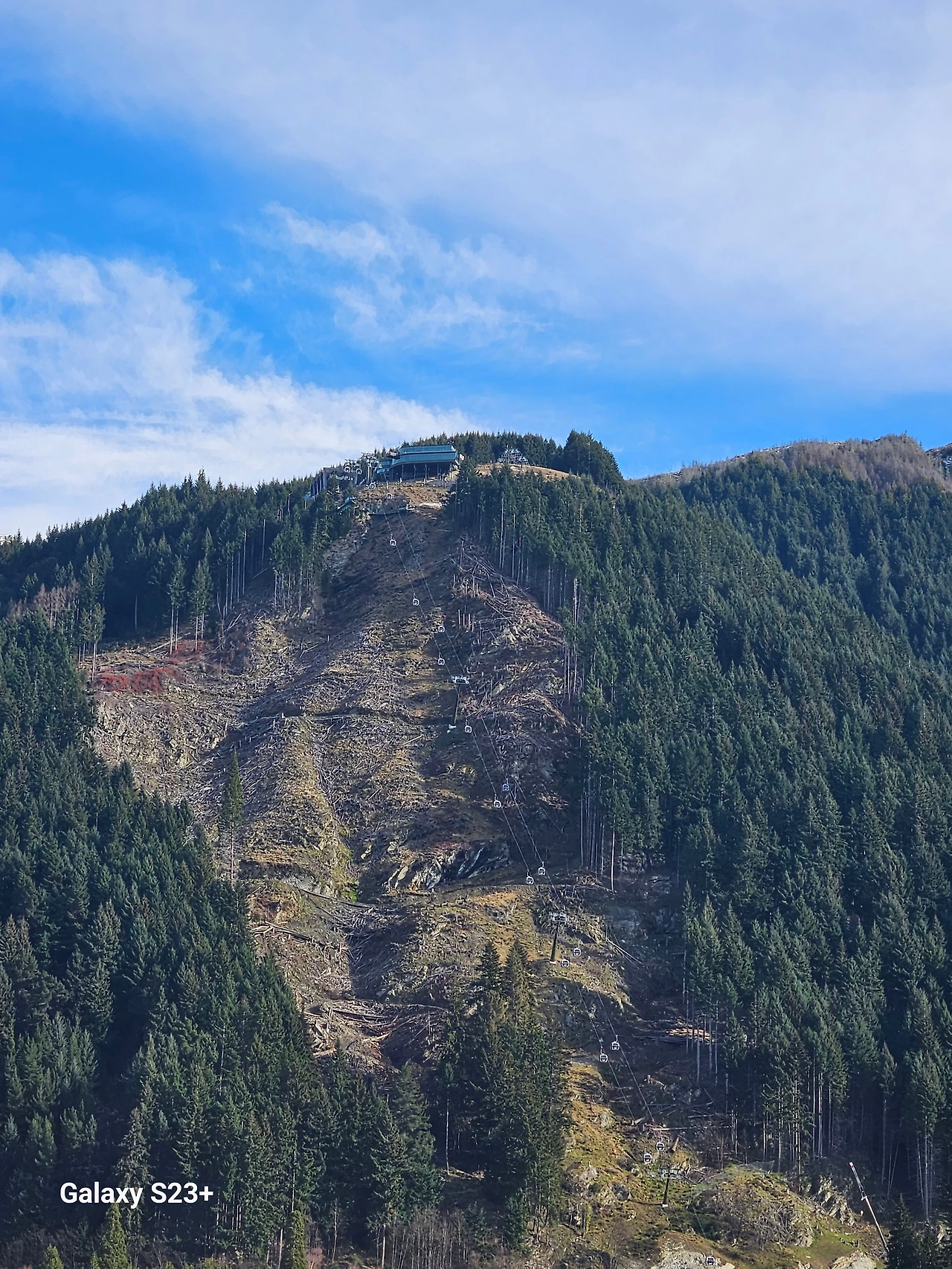 호텔이 언덕 위에 있어서 시내로 내려가는 삼거리쯤에서, 한눈에 180도를 조망할 수 있는 곳이 있다. 왼편으로는 와카티푸 호수가 보이고 맞은편에는 야트막한 산이 보인다. (이름은 모르겠다.) 오른편으로는 호텔들이 죽 늘어서 있는데 그 너머로 퀸스타운 힐(Queenstown Hill)이 보인다. 그런데 맞은편 산 모양이 좀 이상했다. 자연재해를 만난 듯 나무들이 쓰러져있고 파헤쳐진 모습이었다. 왜 그런가 하고 선글라스를 벗고 안경을 썼다. 그래도 자세히 보이지 않아서 카메라로 줌을 해봤다. 그랬더니 곤돌라가 오가는 길이었다.