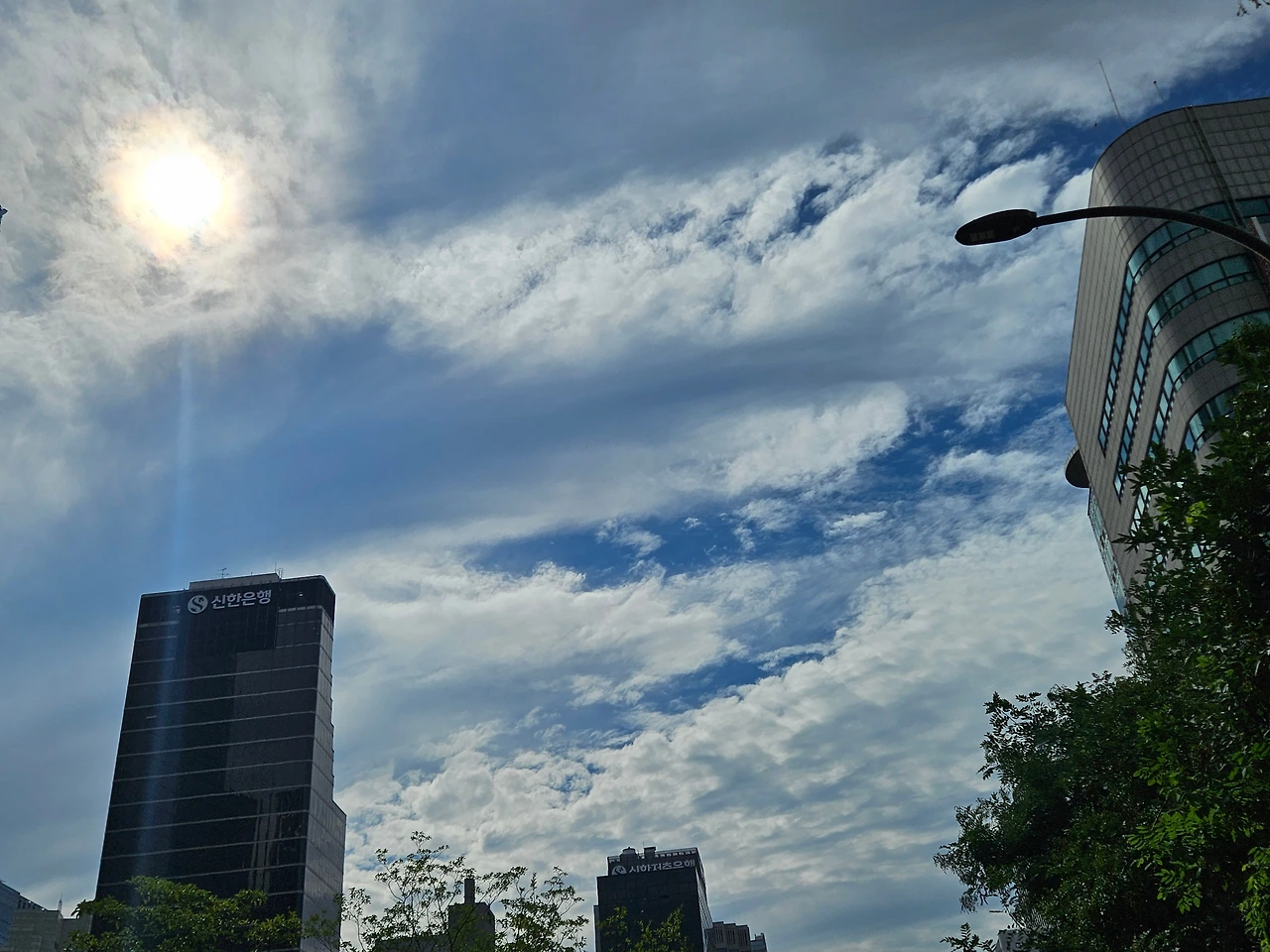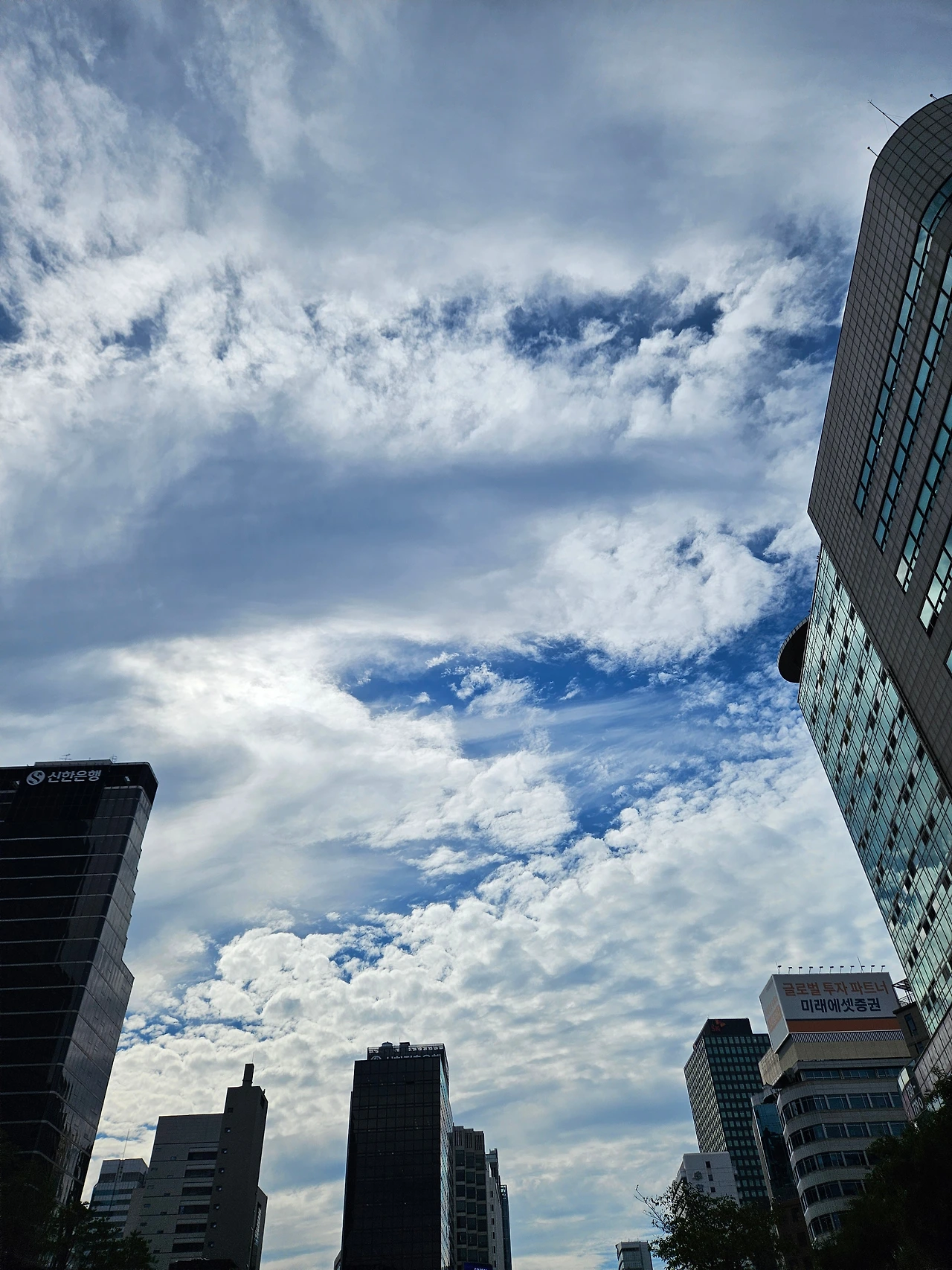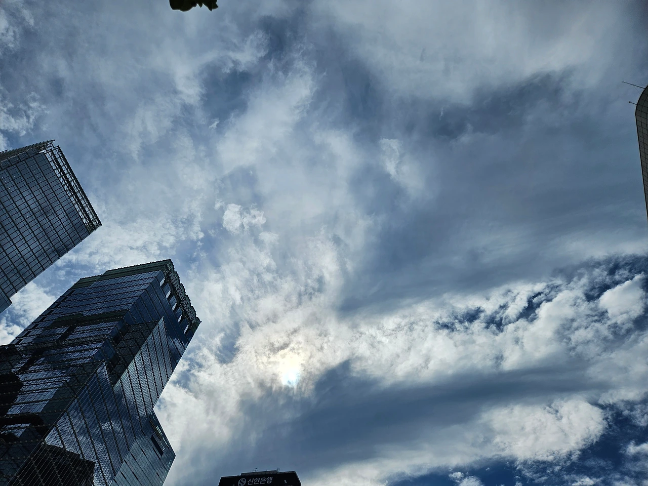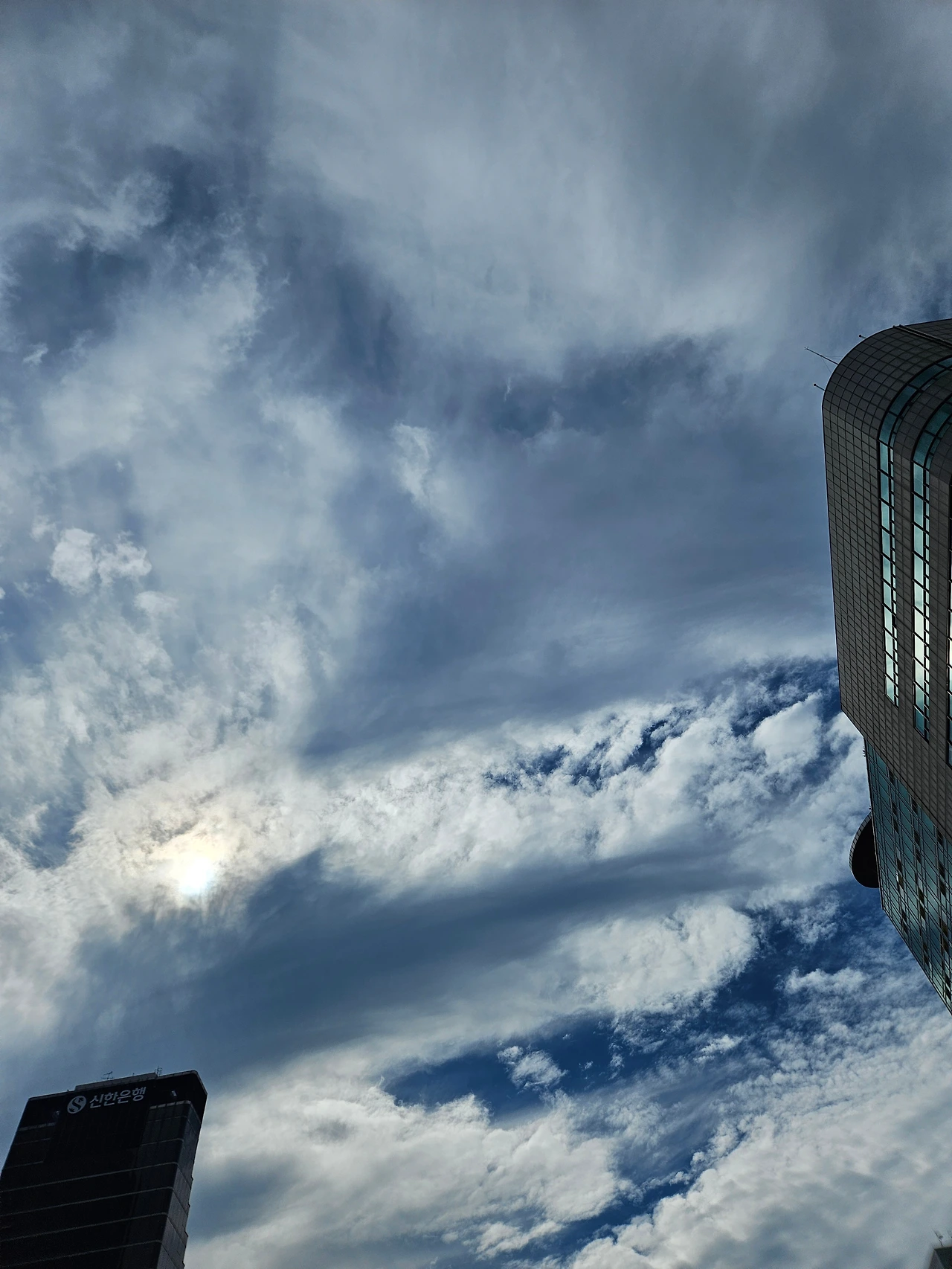 멋지다는 말로는 부족하다. 출근길에 비가 내려 흐릿하기만 했던 하늘이 점심시간을 지나며 또렷한 구름과 하늘의 모양을 갖추는가 싶더니 감탄이 절로 나오는 멋진 모습을 드러냈다. 사무실에서 컴퓨터 모니터에만 시선을 주다가 문득 주변이 환해지는 느낌에 창밖을 봤다. 하늘이 그 고유의 파란색을 드러내고 있었다. 얼른 자리를 박차고 밖으로 나갔다.