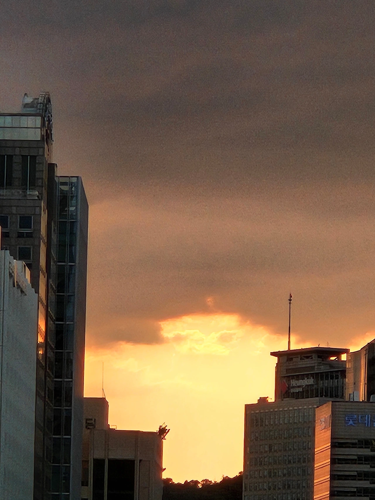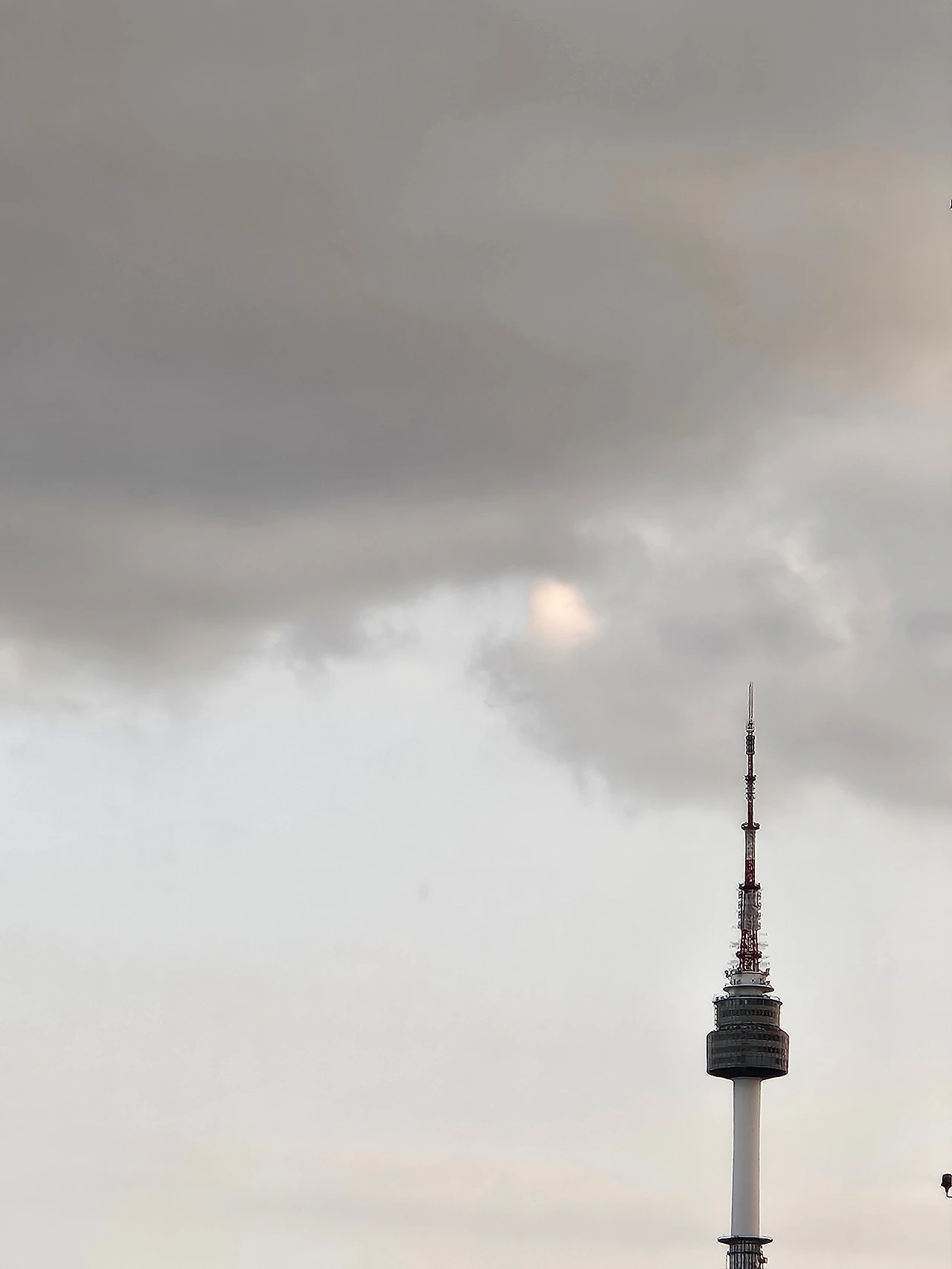 계절이 바뀌는 만큼 어둠이 성큼 다가왔다. 6시 무렵인데 벌써 하늘이 어둑해진다. 남산타워에 걸린 환한 빛은 태양이 아니다. 사진에 찍힌 빛일 뿐이다. 해는 이미 서쪽으로 기울어지고 있었으므로 남산타워에 걸릴 수 없다. 아래 사진은 해가 사라진 동쪽 하늘이다. 같은 시각, 같은 하늘을 찍었는데 자연빛에 따라 색이 달라졌다. 마치 유화 그림을 보는 것 같다.