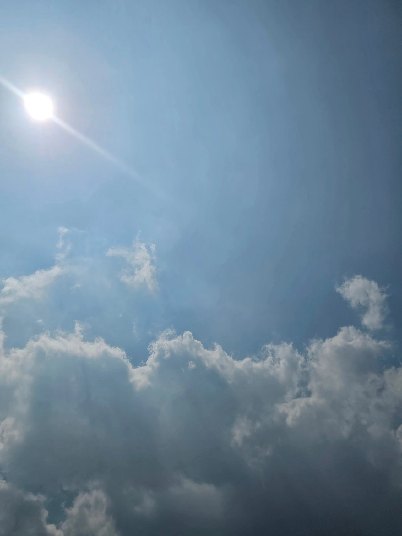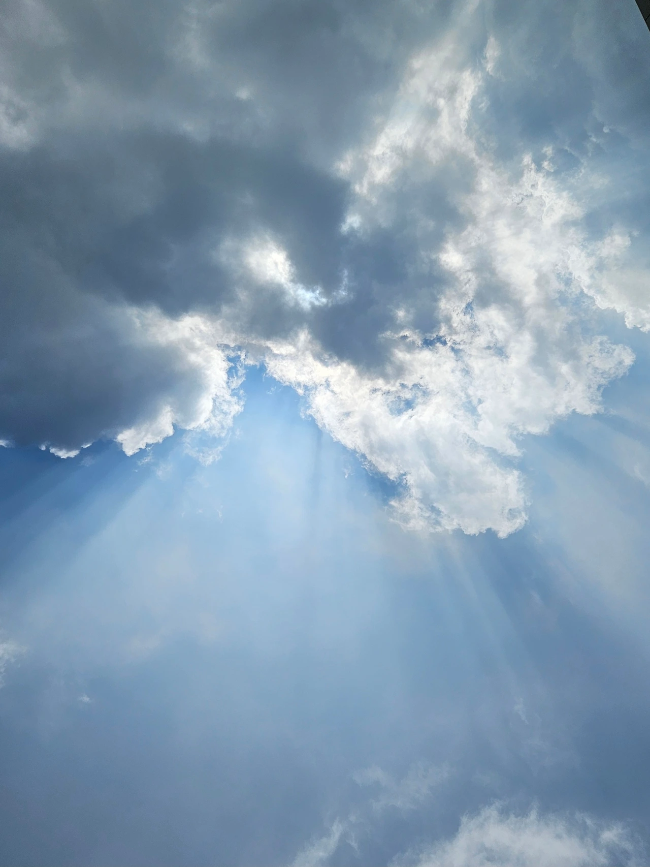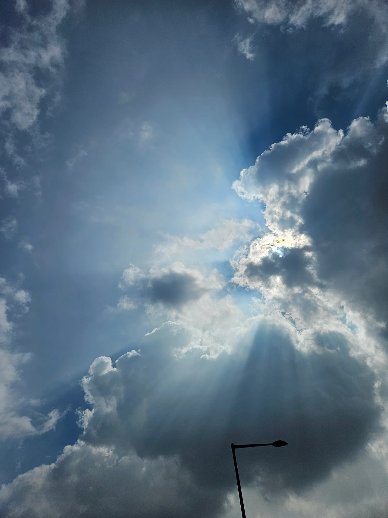햇살이 강한 날, 구름사이로 비치는 빛은 늘 신비롭게 느껴진다. 가운데 구름은 늠름한 눈사람이 팔을 벌리고 있는 것 같다.
