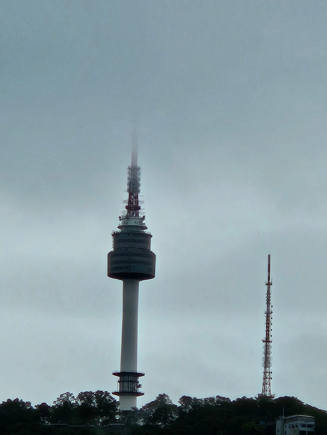김밥을 사러 점심시간에 잠깐 나갔다. 비는 그쳤지만 하늘은 여전히 먹구름 세상이었다. 남산타워가 모습을 드러냈다. 구름인지 안개인지 구분할 수 없는 뿌연 존재가 타워 꼭대기를 가렸다.