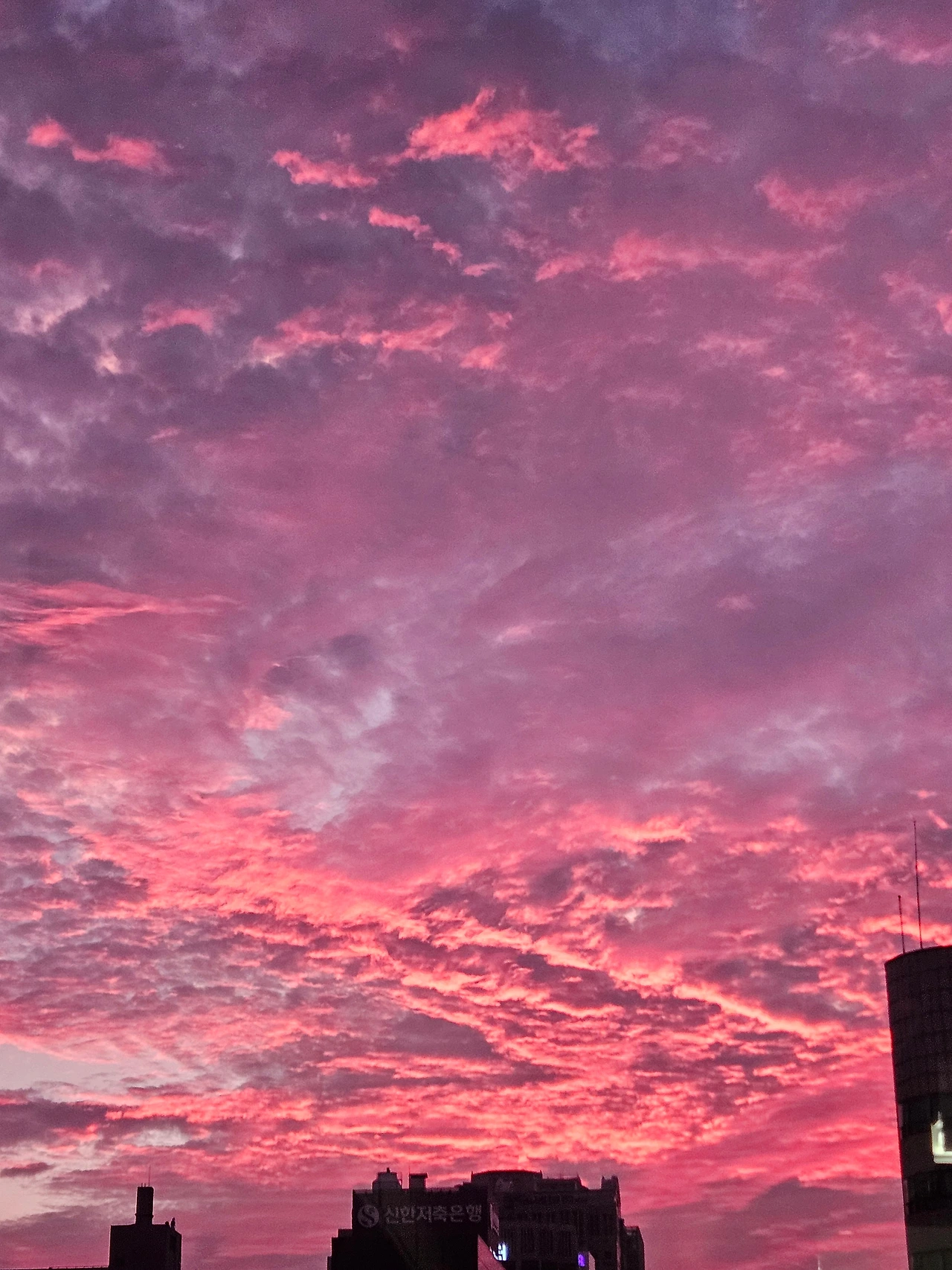 다양한 색으로 물든 하늘은 여러 가지 모양을 했다. 내가 보이는 데로 보는 것이겠지만. 커다란 새의 날갯짓으로 보이기도 하고 용암이 흘러내리는 것도 같다.
