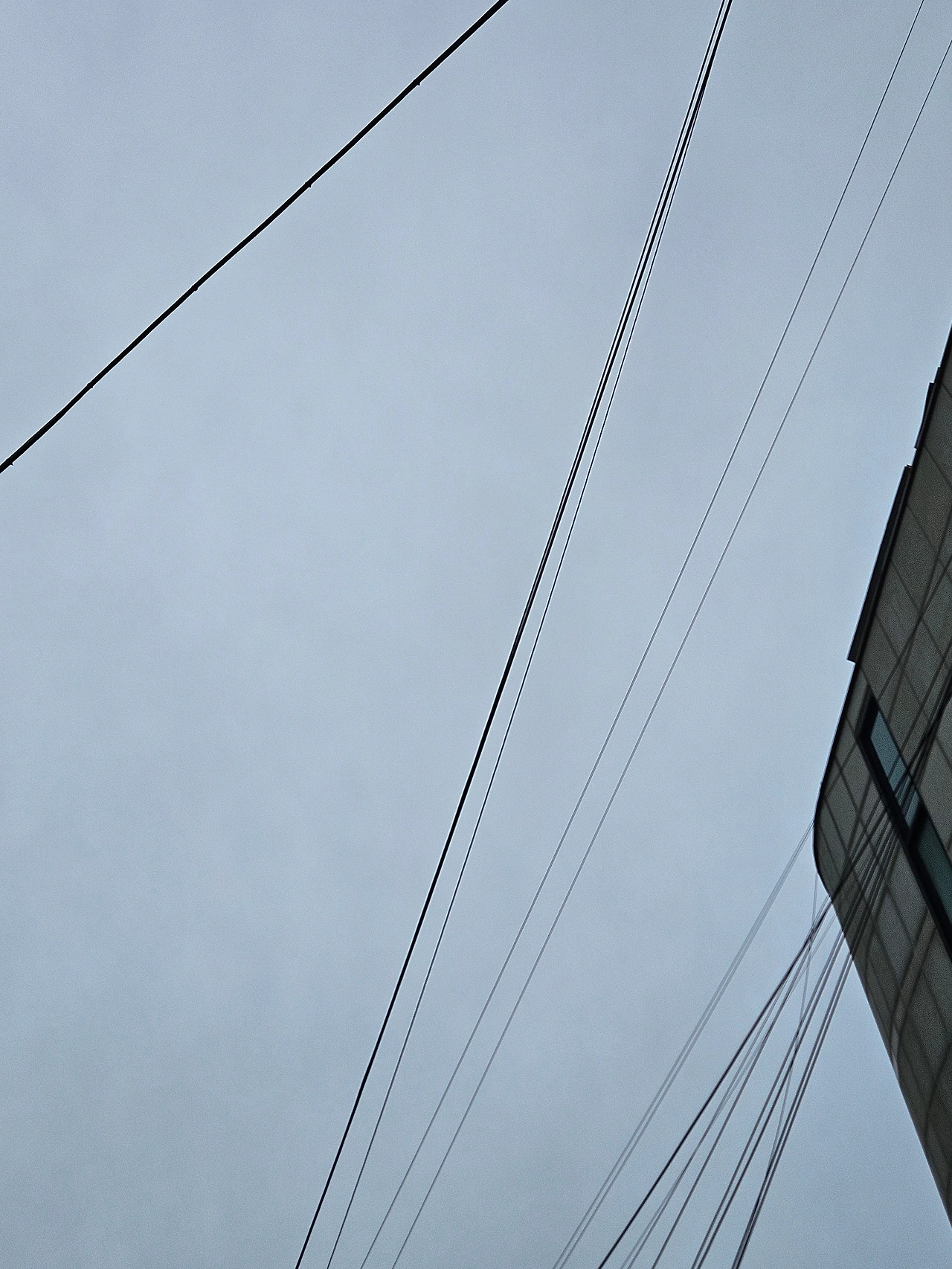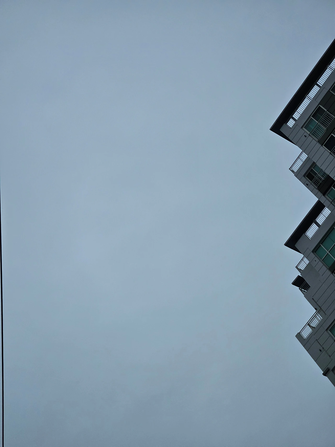 사진으로는 푸른빛이 돌지만 맨 눈으로 보기엔 그냥 희뿌연 하늘이다. 흰 천으로 덮었거나 하얗게 페인트 칠을 한 듯 구름 조각 없이 매끈하다. 그저 하늘이라는 바탕에 통으로 물감을 부어 붓으로 펴놓은 것 같다. 좀 더 두꺼워 보이거나 어느 쪽이 얇아 보이거나 구름이 층층이 쌓여보이거나 하지 않고 그 두께가 균일하게 칠해진 것 같다. 아무 표정도 아무 느낌도 없는 백지 같다. 답답하다. 숨 쉴 틈 없이 꽉 막혔다. 하늘이 숨 쉬는 유기체라면 질식할 것 같은 날이다.