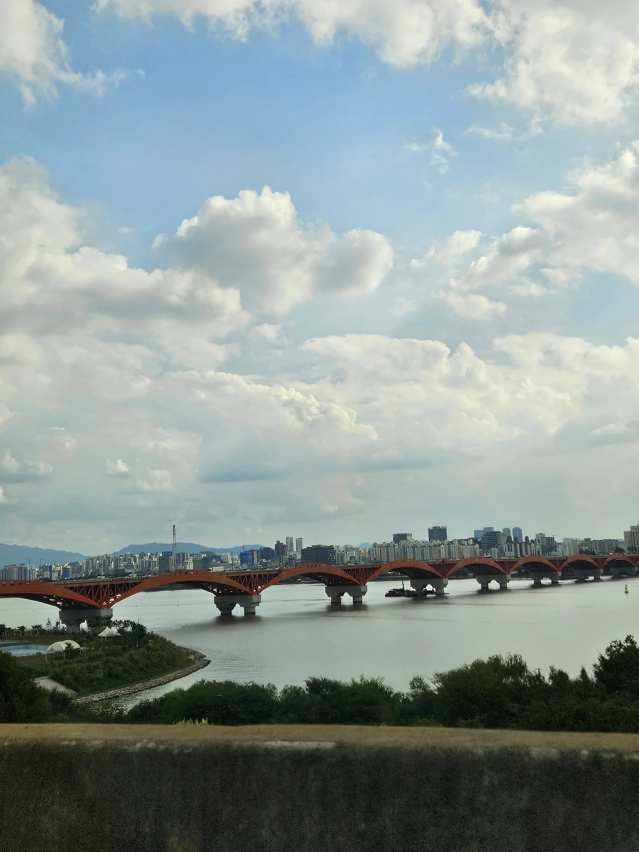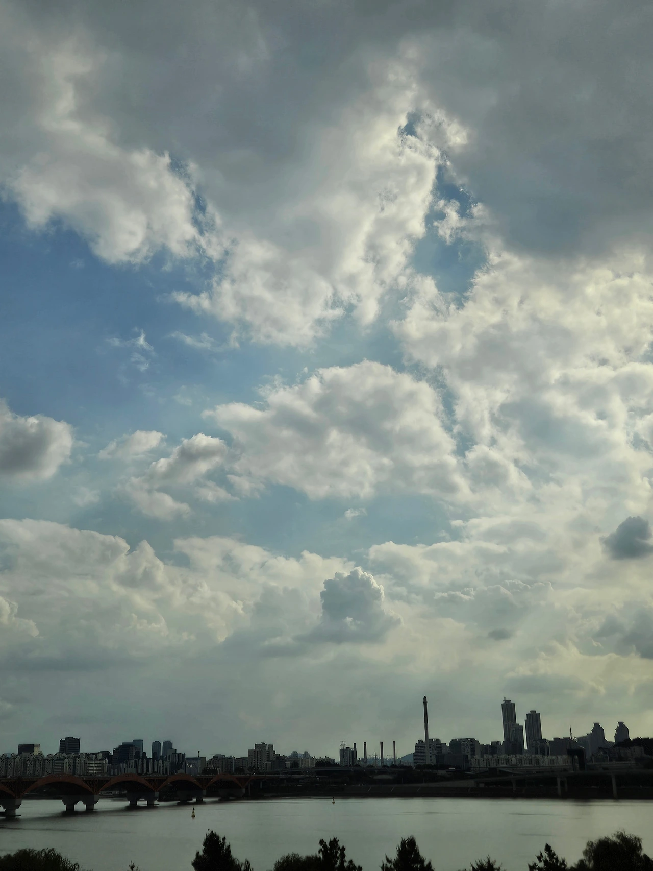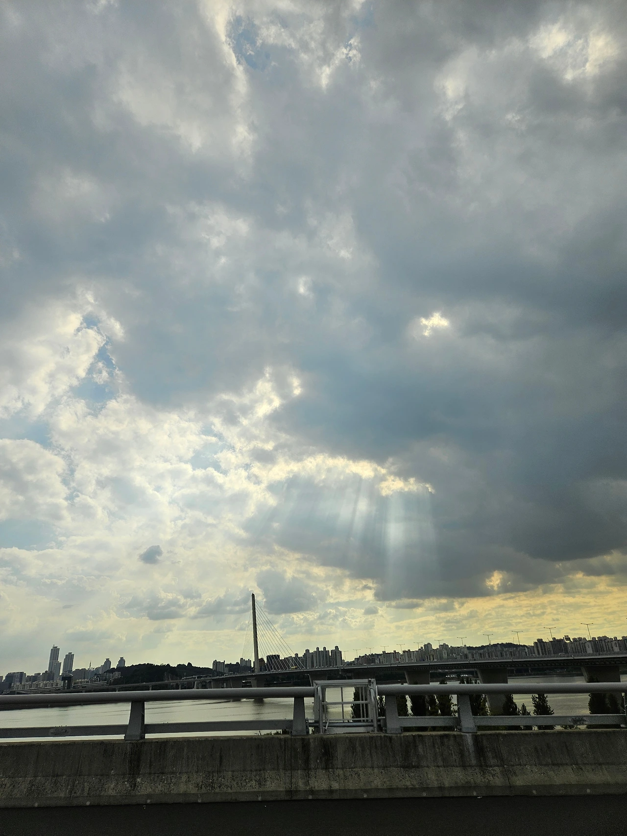 한강 풍경이 멋있다. 내가 찍었지만 한강, 한강다리, 구름을 한 장면에 잘 담은 것 같다. 달리는 택시 안에서 찍었는데도.