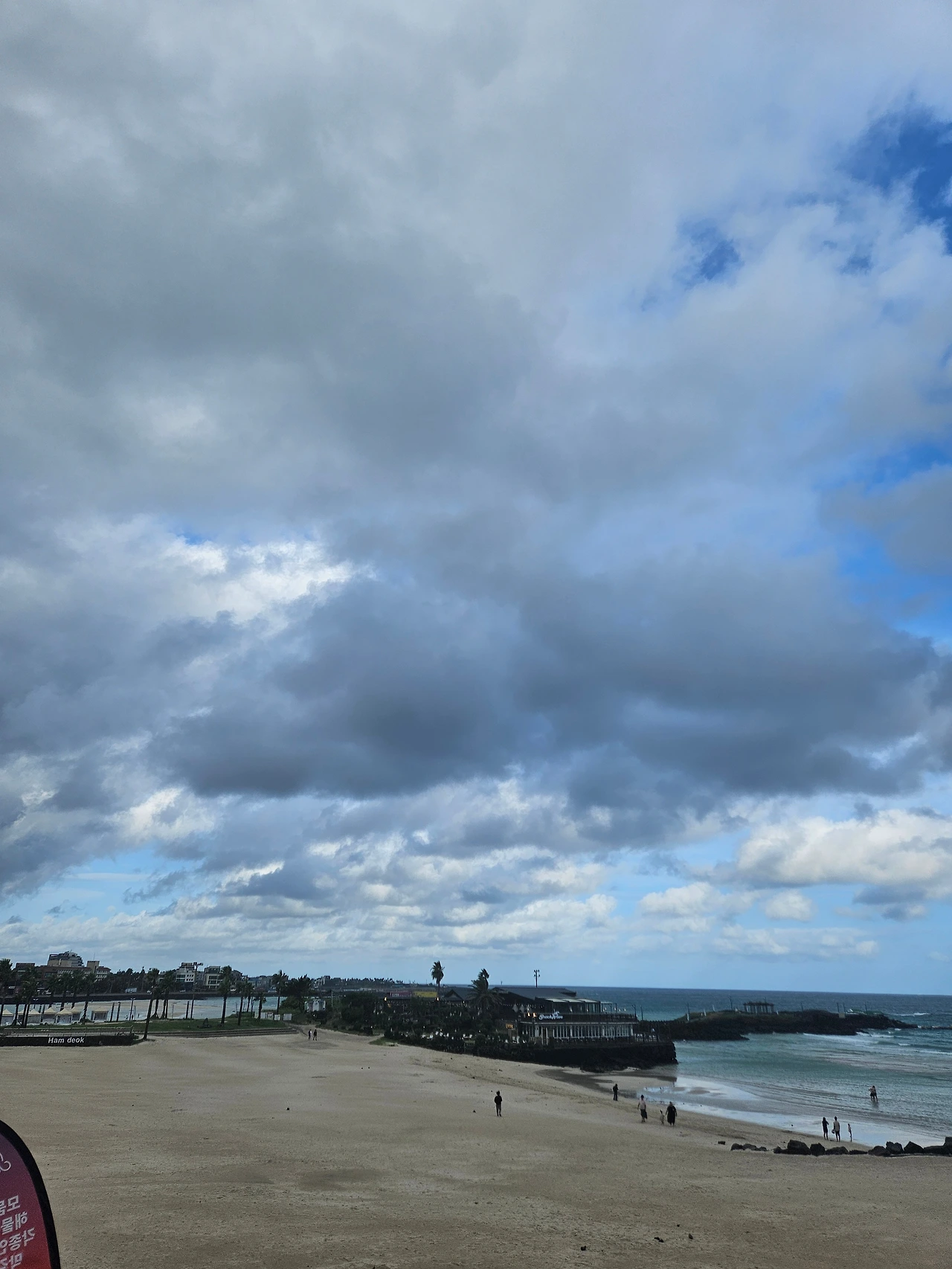 이른 시간이라 함덕 해수욕장에는 인적이 드물었다. 먹구름이 낀 하늘에 빗방울이 내리기 시작했다. 우산 없이 나간 터라 차양막이 처진 가게 앞에서 비를 피하며 사진을 찍었다. 비가 세차게 내리지 않아 맞을만했다. 하늘에 먹구름 뒤로 맑은 구름이 몰려오고 있었기에 비 맞을 걱정은 하지 않았다.