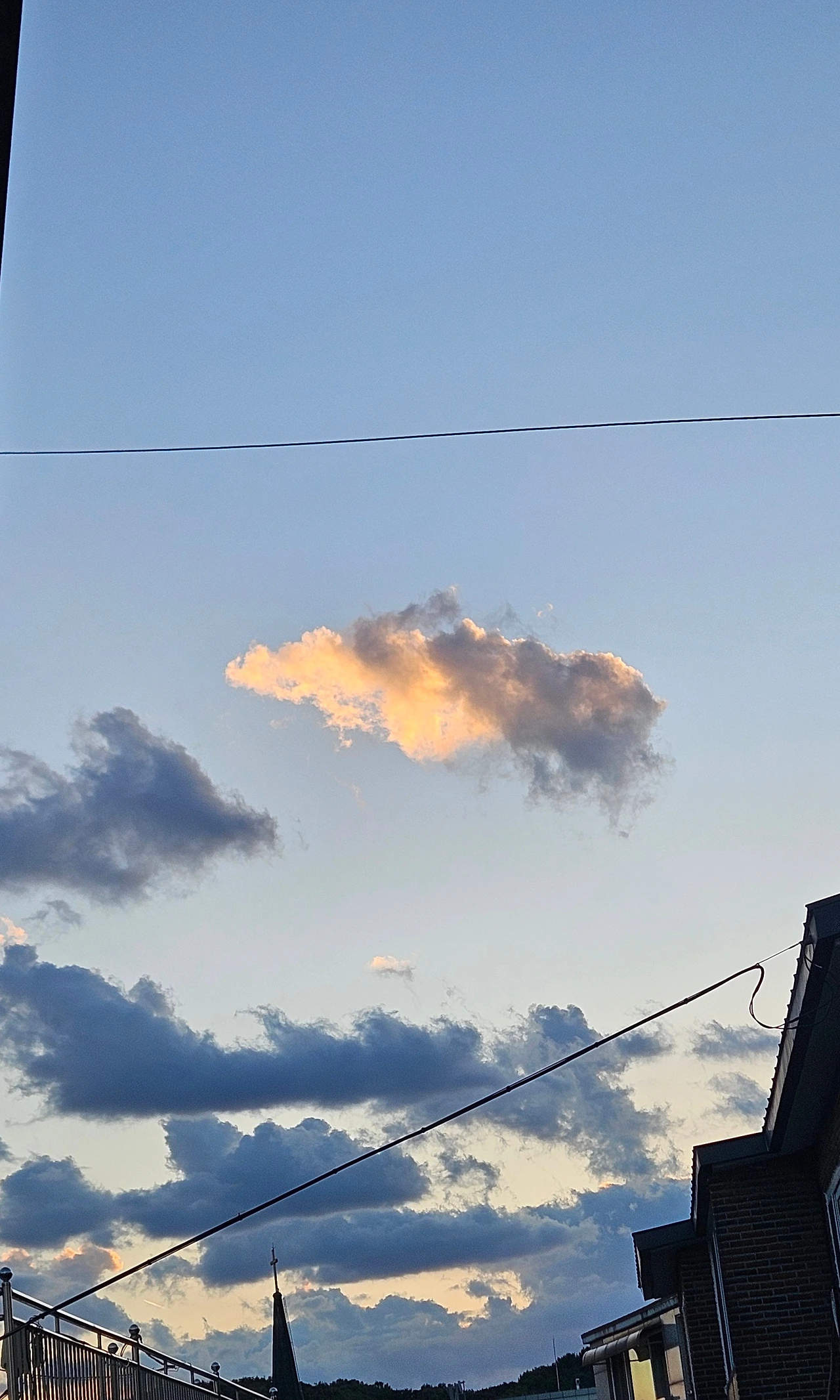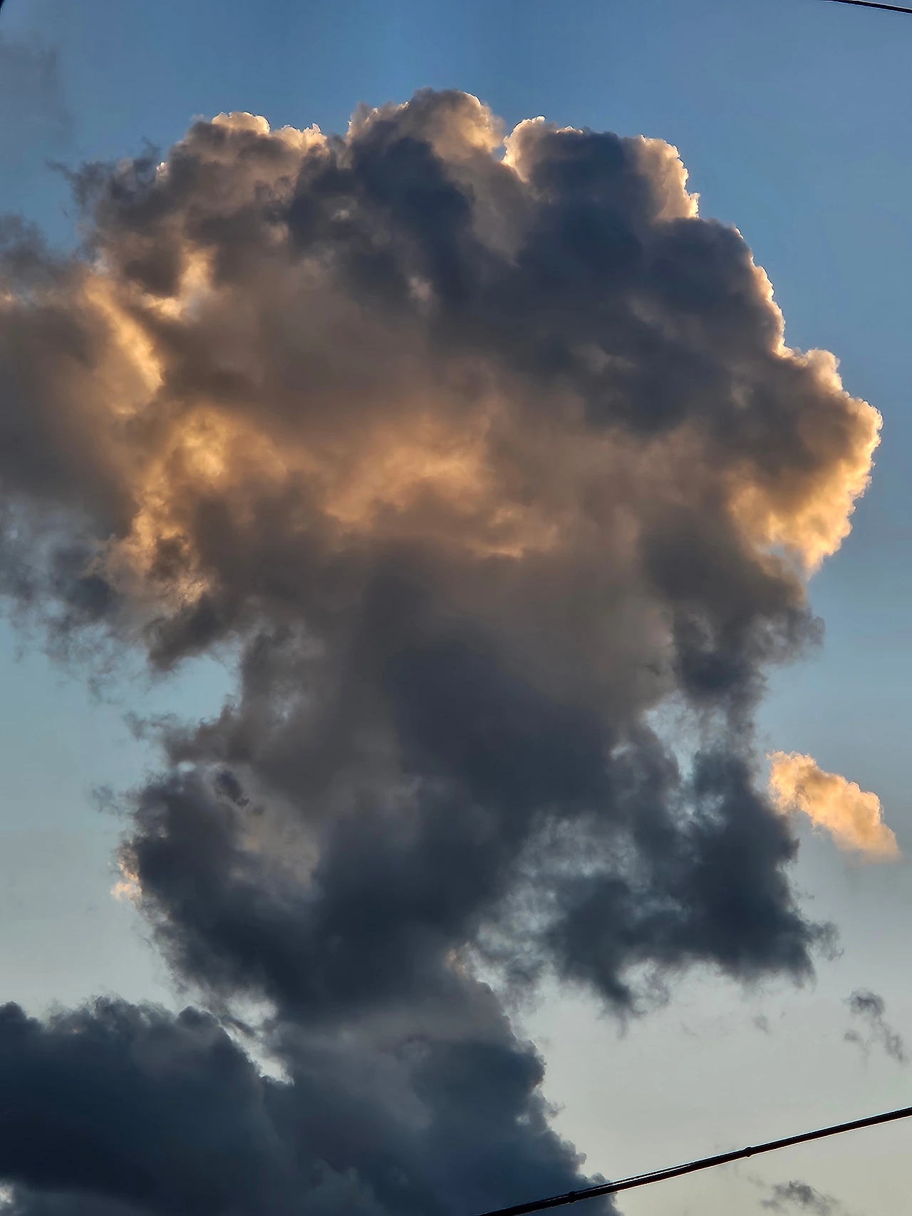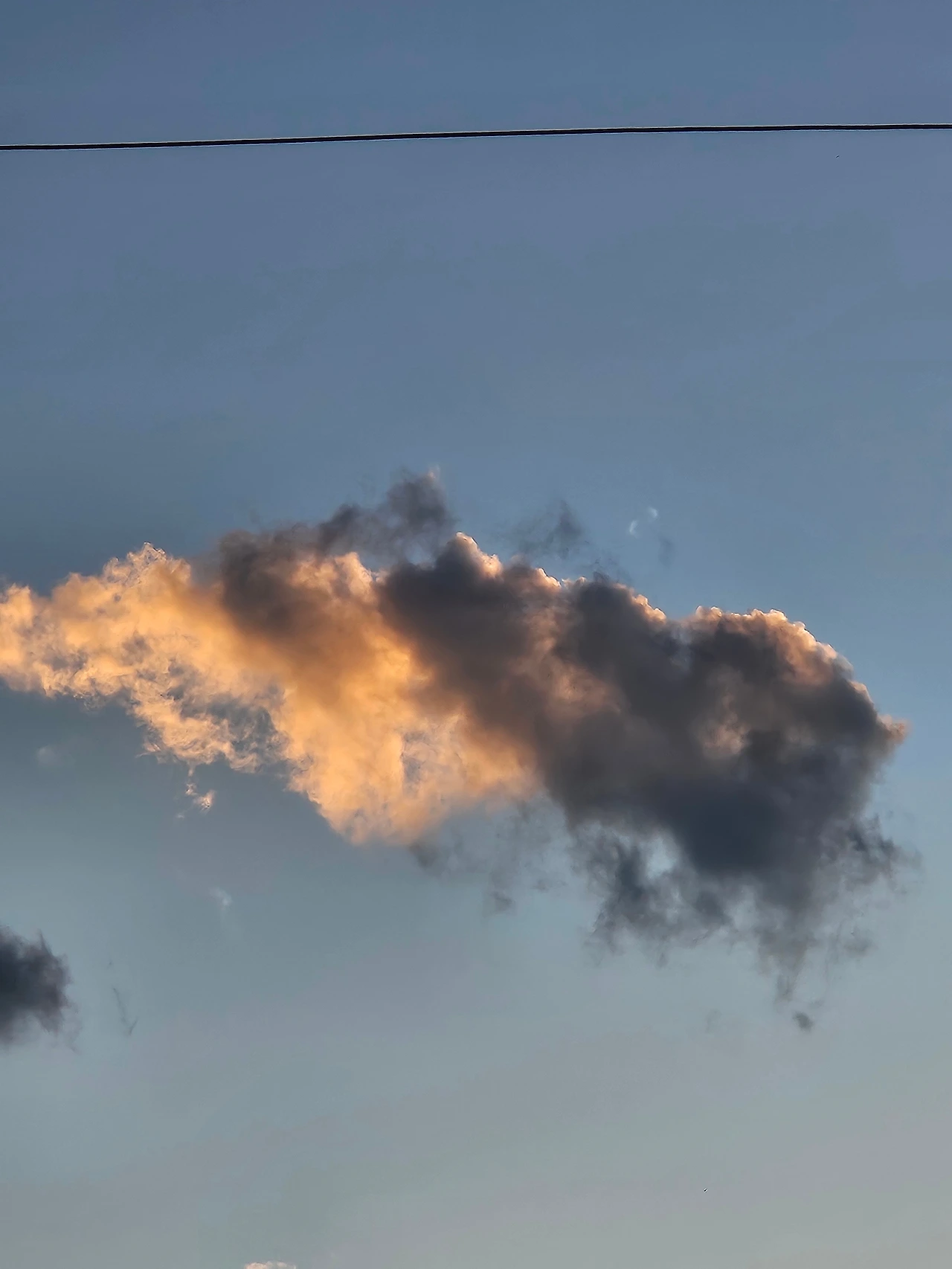 타다만 듯 그을림이 묻은 모습. 검은 구름이 마치 연기처럼 보인다. 주변은 푸른빛 회색 구름인데 홀로 노랑빛 주황구름이다.