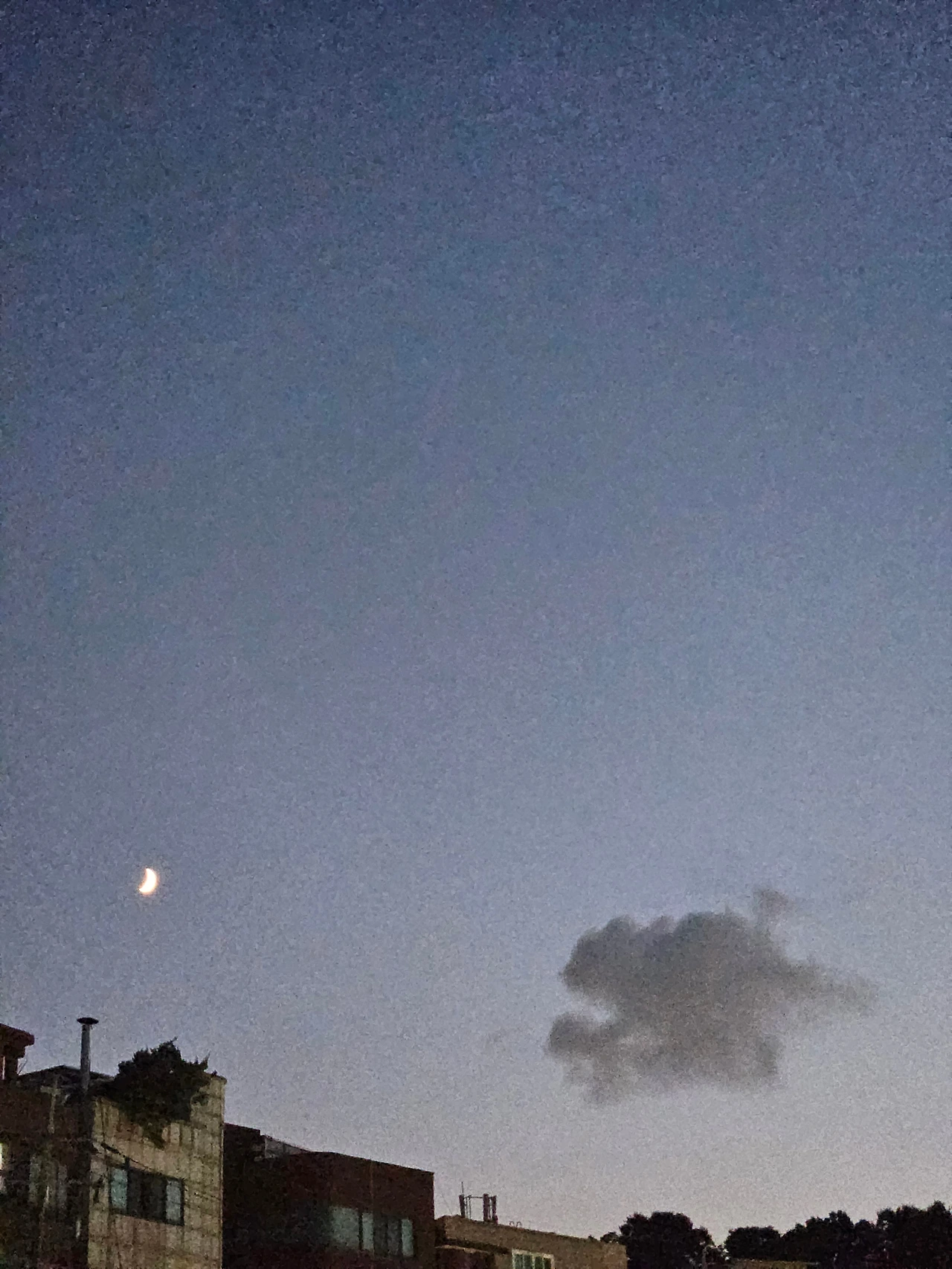 연습실 가는 길에 본 초승달. 달을 확대하지 않고 보면 그저 한 점 빛으로만 찍힌다. 육안으로 보면 정말 예쁜 달인데 사진으로는 확대를, 그것도 30배를 해야 달처럼 보인다.
