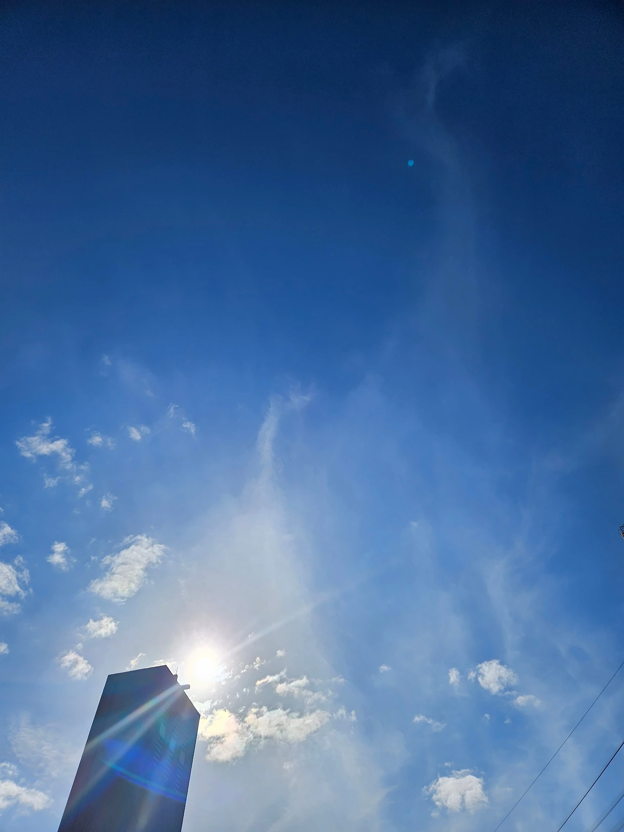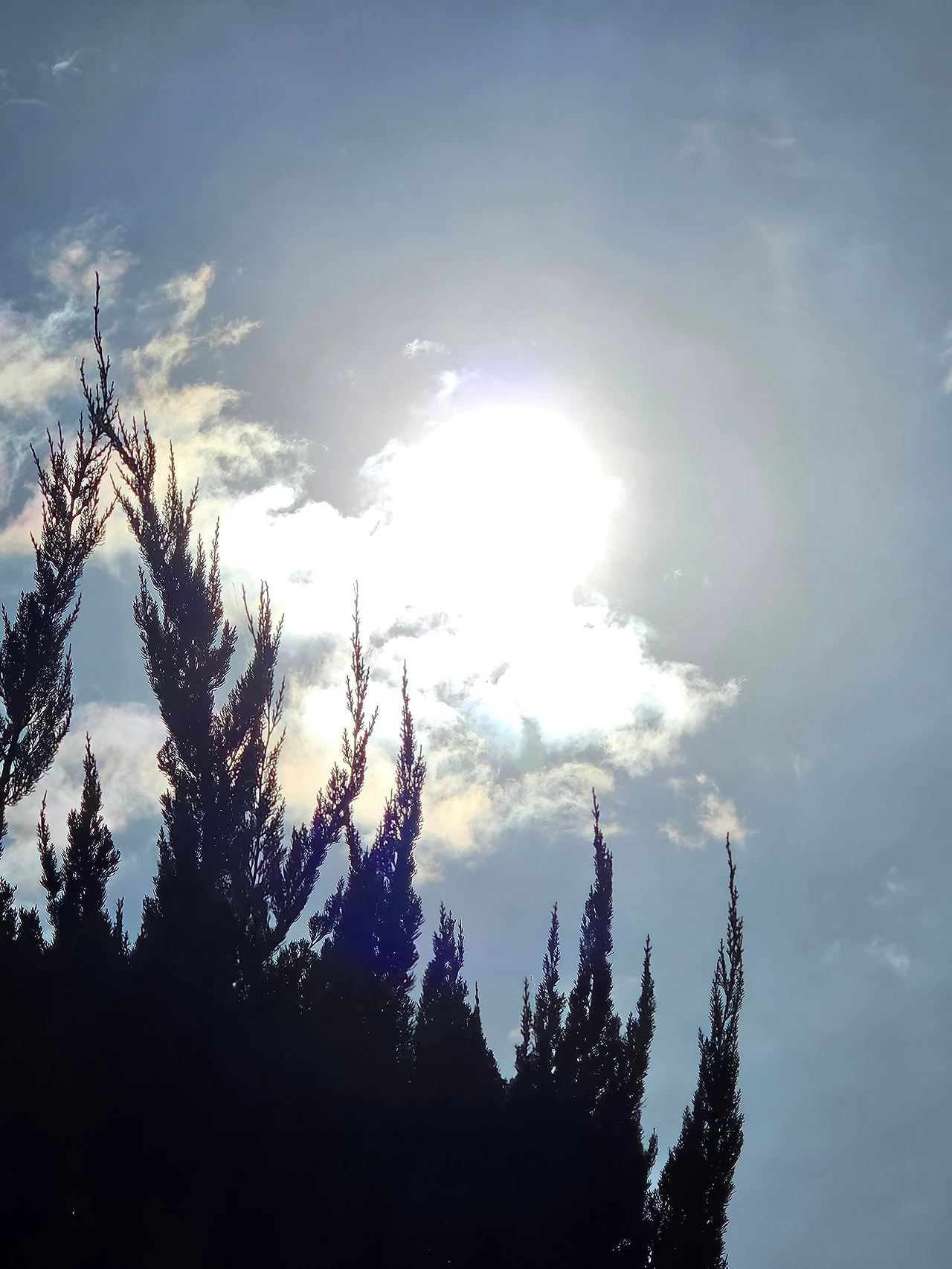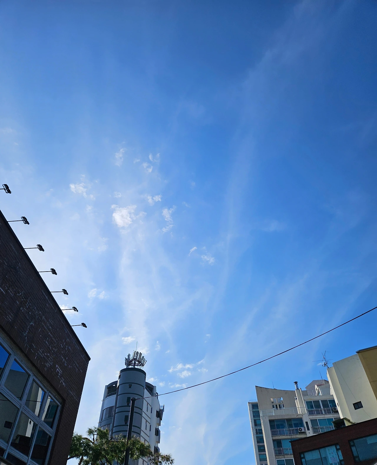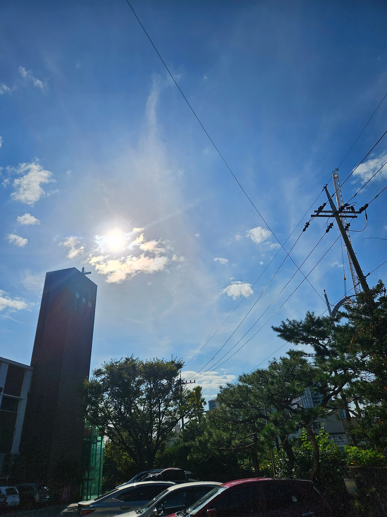 화실에서 집으로 가는 길, 태양빛이 역광으로 비친 모습이 가을 느낌 난다. 오른쪽 사진은 마스크를 쓴 외계인 혹은 요괴 혹은 괴물이 눈에서 연기를 뿜는 것 같다. 옅은 구름은 춤을 추는 것처럼 움직임의 흔적을 길게 남겼다.
