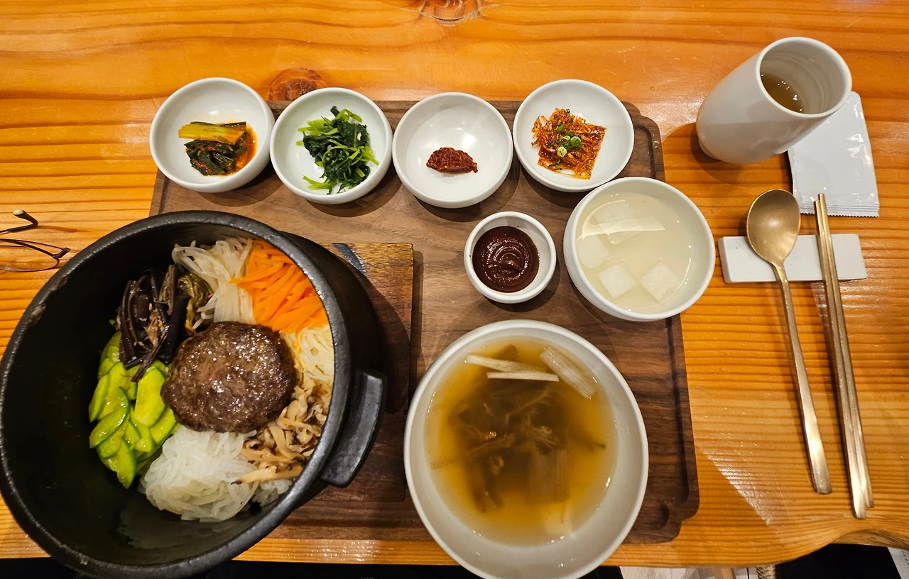 오늘 먹은 곳은 돌솥이 아주 뜨겁지 않았다. 적절한 온도였다. 밥 위에 각종 야채와 떡갈비가 올라간 모양을 젓가락으로 헤집어 바닥을 봤는데 밥이 눌어붙지 않았다. 밥을 떼내려고 애쓰지 않아도 되었다. 신기했다. 이렇게 절묘하게 온도를 맞추어 돌솥밥을 내올 수 있다니 괜히 고급식당이 아니구나 싶었다. 비빔밥은 짜지도 싱겁지도 않게 내 입에 딱 맞았다. 먹다 보니 밥 한 톨 남기지 않고 싹 먹었다. 반찬도 다 먹고 아주 깨끗한 그릇만 남겼다. 저녁을 먹지 않아도 될 정도로 많이 먹었다.