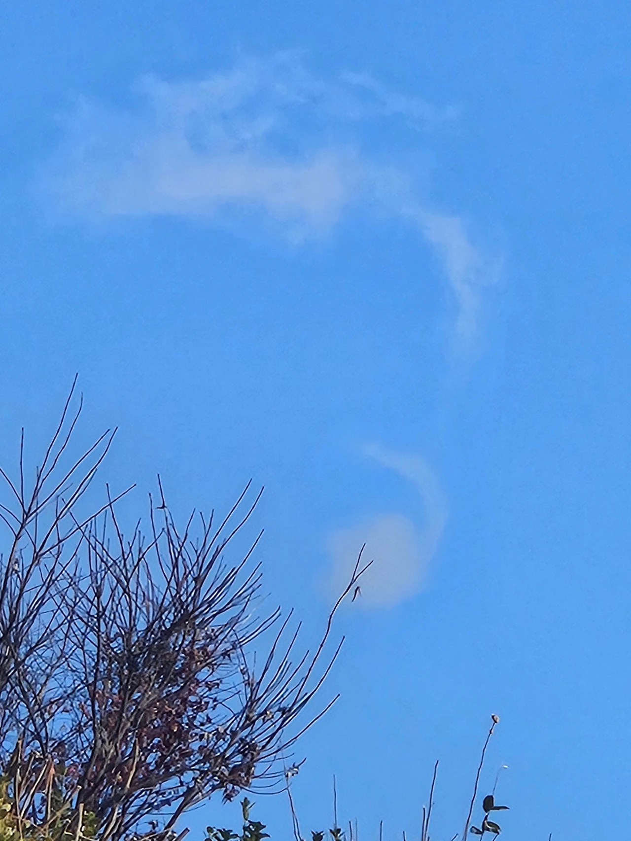 하늘에 떠있는 구름을 보다가 물음표처럼 생긴 구름을 발견했다.나뭇잎이 다 떨어져 앙상한 나뭇가지 위에 뜬 물음표. 하늘도 의아한 것이 아닐까?