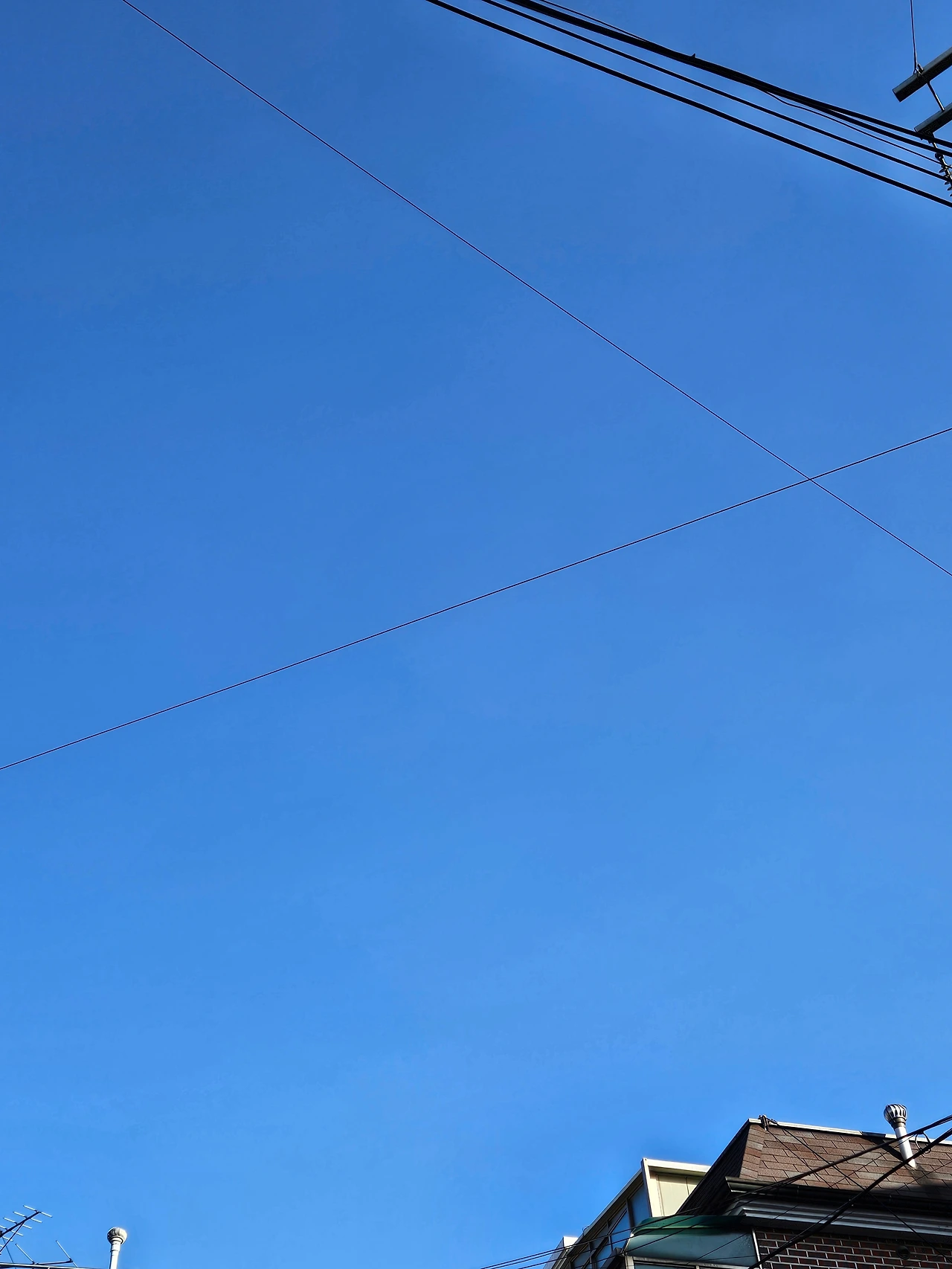 점심시간을 활용해 엄마를 모시고 치과에 갔다. 내 잇몸 치료도 할 겸. 나간 김에 은행 업무를 봤다. 엄마가 거의 3주 만에 제대로 걷기를 하셨다. 처음엔 다리에 힘이 들어가지 않았는데 20분쯤 걸으니 힘이 들어간다고 하신다. 은행일을 다 보고 집에 다다르자 하늘 사진 찍지 않은 게 퍼뜩 떠올라 집 앞에서 성의 없이 두 컷을 찍었다.