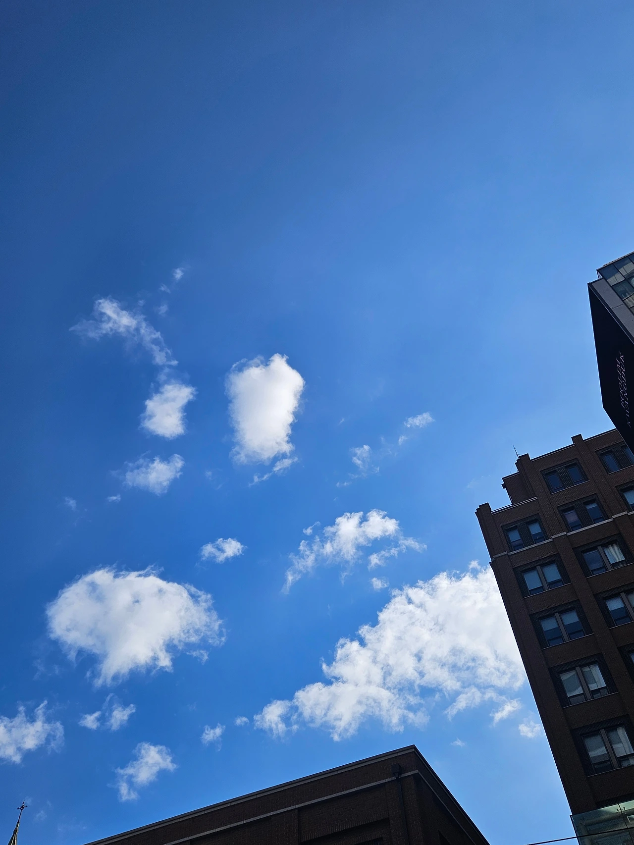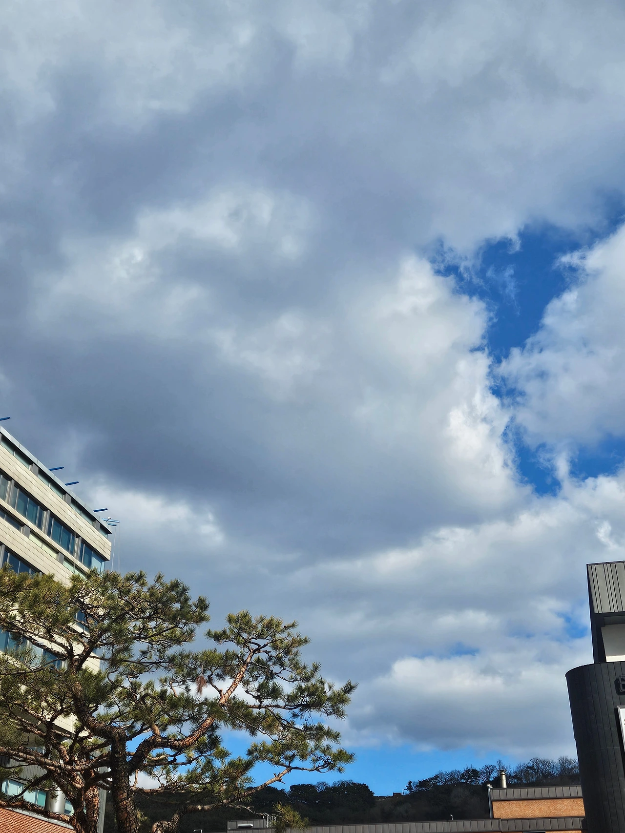 낮 기온이 10도에 육박하는 봄날 같은 날이었다. 미세먼지는 물론이고 초미세먼지 없는 아주 맑은 날이었다. 패딩이 덥게 느껴졌다. 패딩 지퍼를 내리고 따뜻한 햇빛을 느꼈다. 하지만 그늘이 드리운 곳에 들어서자마자 찬 기운이 바로 몰려왔다. 건물을 사이에 두고 그늘이 진 곳과 햇빛이 비추는 곳의 온도 차이가 극명했다. 하늘도 그랬다. 찬란한 햇빛으로 눈이 부실 지경의 하늘인가 하면 명동성당 건너편 빌딩 숲의 하늘에는 짙은 먹구름이 드리워져 있었다. 저 먹구름이 몰려오는 것인지, 밀려나는 것인지 알 수 없었다. 지금 우리나라의 혼란한 상황이 연상된다. 극단으로 치닫는 분열된 모습이 점점 심해질 것인지 가라앉을 것인지 알 수 없다. 먹구름이 몰려오는지 밀려나는 것인지 알 수 없듯이. 다만, 구름이 밀려나는 중이라면 맑은 하늘이 점점 더 넓어질 텐데 하는 작은 희망을 부질없이 가졌다.