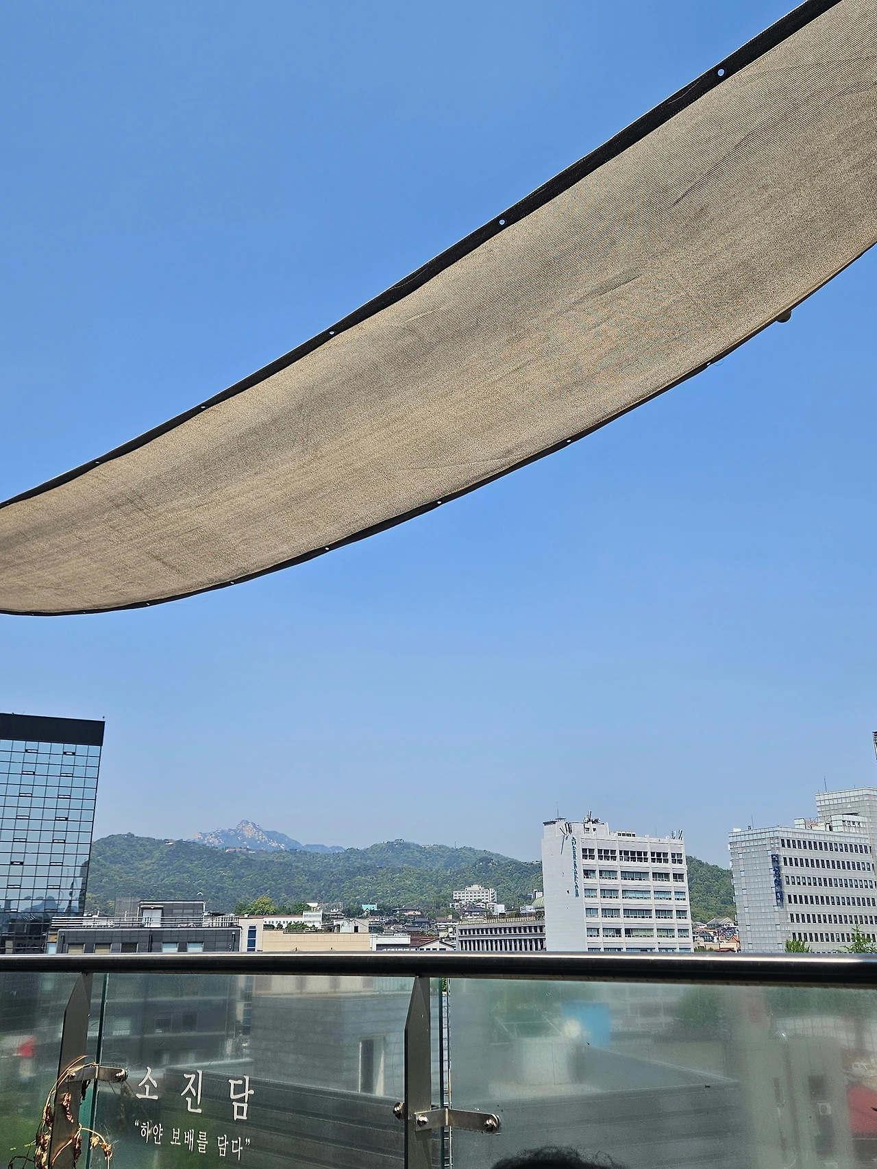 같이 일했던 동료를 만나면 호칭이 애매하다. 보통은 그 동료가 퇴사할 무렵의 직급을 부른다. '대리'로 관둔 사람은 '00 대리'라고 부르고, 본부장으로 퇴사한 상사는 다른 회사에서 다른 타이틀로 일하는데도 늘 '000 본부장님'이라고 부른다. 그 호칭이 입에 익어서 그렇기도 하지만 이름을 직접적으로 부를 수 없기 때문이다. 아주 막역한 사이가 된 경우라면 언니, 누나, 동생이 가능한데 그 정도로 친하지는 않다. 그렇다고 아주 어색하고 낯선 관계도 아니다. 그런 사이라면 퇴사 후 연락이 끊어졌을 것이다. 꾸준히 연락하고 지낼 정도로 친한데 이름으로 막 반말하며 만나는 관계는 아니다. 오늘 만난 M은 해외업무를 많이 했기에 영어 이름을 자주 사용했다. 우리는 자연스럽게 그의 영어이름을 부른다. 호칭 걱정을 하지 않아 편하다. 가끔 영어권의 이름 부르는 문화가 편리할 때가 있다. 두부집에서 식사 후 차를 마시러 카페로 갔다. 일행 중 한 명이 "이렇게 좋은 날엔 루프탑에서 마셔야죠"라고 하며 우리를 이끌었다. 과연, 가슴이 탁 트이는 곳이었다. 멀리 인왕산과 북한산이 보이고 사방이 막힌 곳이 없었다. 대신 차값과 조각 케이크 값은 사악했다. 우리는 모두 케이크를 좋아하지 않아 먹어볼 생각을 아예 못했지만, 케이크는 딱 보기에도 당이 엄청 많을 것 같았다. 하지만 비싼 가격을 상쇄시킬 만큼 뷰가 멋진 곳이다.
