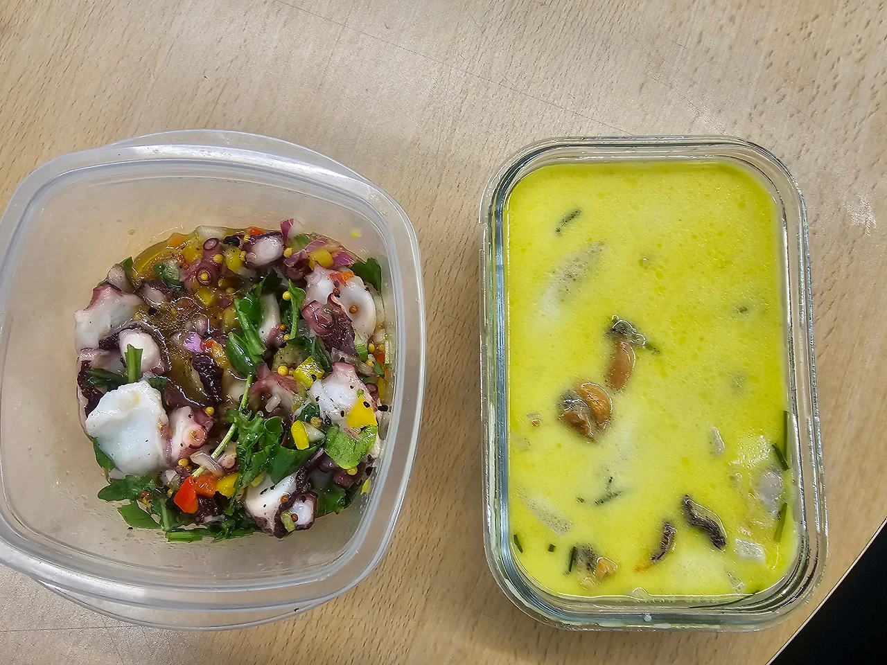 겨우 두 가지 음식을 다했다. 그 자리에서 먹을 수도 있고 포장할 수도 있는데 같이 간 후배와 나는 포장하기로 했다. 후배가 바로 회의가 있다고 하여 시간이 부족했다. 만든 음식을 회사로 가져와 시식했다. 병어 스케이트를 데워먹으라 했는데 그릇을 만져보니 미지근해 그냥 먹었다. 먹다 보니 크림 때문에 좀 느끼했다. 강사가 만든 음식은 전혀 느끼하지 않았는데 이상했다. 레시피에 있는 대로 똑같이 계량도 했는데. 세비채 맛은 강사의 것과 거의 비슷했다. 소스로 만들어 여러 요리에 부어 먹어도 좋을 것 같다.