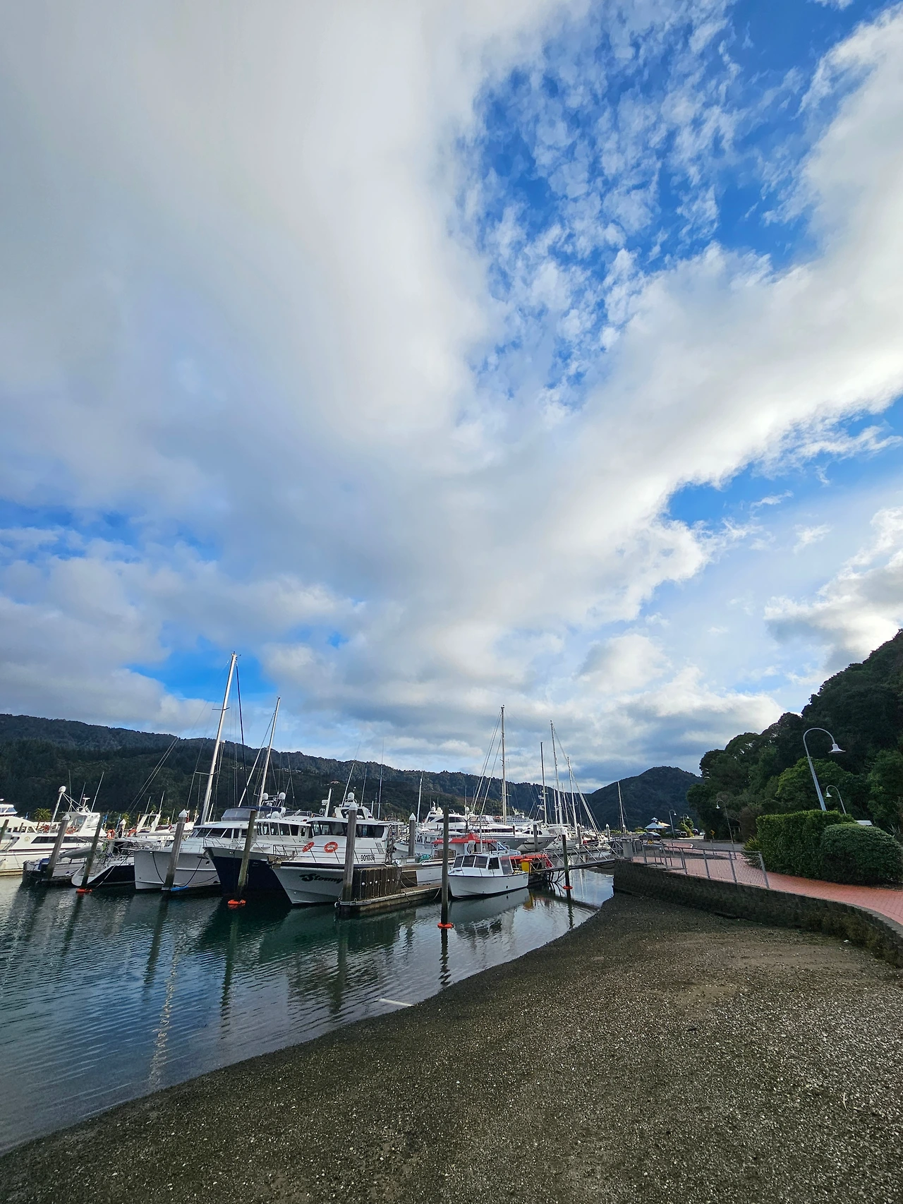 픽턴에서 와인투어 다음으로 좋았던 건 멋진 풍광을 본 것이다. 아침에 둘러본 항구 주변은 어디를 보아도 예뻤다. 뉴질랜드 특유의 낮은 하늘과 구름은 물론이고 바다 저 멀리 떠있는 요트는 한 폭의 그림이었다. 언제나 느끼는 거지만 이런 자연풍광을 보고 산다면 화 낼 일이 없을 것 같다.