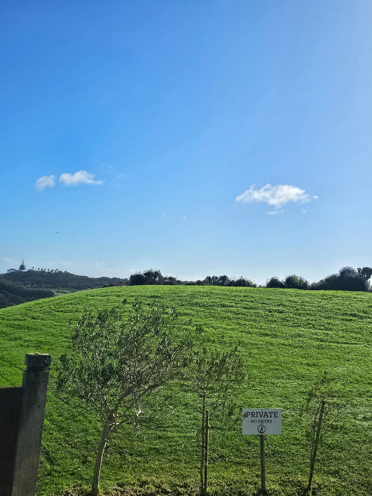 휴가 오기 전, 와인을 무척 좋아하는 직원이 뉴질랜드의 유명한 와인이라며 사다 달라고 요청했다. 그 와이너리가 이 섬에 있다. 와이헤케섬에 온 이유가 그 와인을 사기 위해서다. 오클랜드에서 무엇을 할지 별 계획을 세우지 않았으므로 자연스럽게 하루는 이 섬을 여행하기로 했는데 잘한 일인 것 같다. 무엇보다 날씨가 정말 좋아 경치가 다 아름답다. 블레넘의 와이너리는 겨울이라 포도나무만 앙상하게 있었는데, 여기도 물론 그렇지만 주변이 더 푸르고 나무들의 잎이 무성하고 햇빛이 좋아 더 푸르러 보이고 더 풍성해 보인다. 우리는 딱 두 군데만 내리기로 했다. 와인을 사야 하는 와이너리와 바닷가. 나머지 정차 지역은 그냥 버스로 둘러봐도 충분해 보였다. 일곱 번째 정류장에서 내렸다. 중국인 부부로 보이는 두 사람, 조카와 나, 유럽에서 온 듯한 남자 한 명 이렇게 다섯 명이 그 정류장에 내렸다. 이곳에서 갈 수 있는 와이너리가 여섯 군데인데 길이 하나만 보였다. 목적지는 다 다를 것 같지만 일단 길이 하나이므로 앞서거니 뒤서거니 하며 걸었다. 조카와 나는 끝없이 펼쳐진 포도밭과 초록 들판에 감탄하며 사진 찍기 바빴다. 한 20분쯤 열심히 갔는데 와이너리 입구의 간판이 우리가 가려던 곳과 다르다. '엇, 여기가 어디지?'