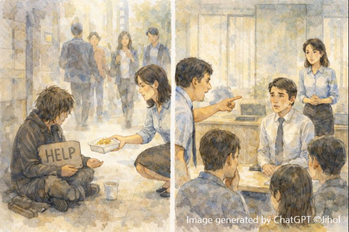 친한 동료, 친구에게 좋은 사람으로 비추고 싶은 마음 때문에 할 말을 하지 못하는 경우도 있다. 상대가 상처받을까 봐 염려된다고 하지만, 관계가 어그러질까 봐 두려운 마음이 더 크다. 하지만, 친한 관계를 유지하려면 서로의 장, 단점을 이해하고 수용하는 자세도 중요하지만 잘못된 부분은 알려주는 편이 더 좋은 관계를 유지하는 방법일 것이다. 남의 잘못은 크게 보여도 자신의 잘못은 티끌처럼 보이므로, 잘못한 걸 모를 수도 있다. 친한 회사 후배와 약속한 적 있다. 뭐가 잘못됐는지 모르는 눈치면 솔직하게 알려주기로. 그 일로 서로에게 화내지 않고 고마워하기로. 진정으로 상대를 위한 말은 비록 쓴소리일지라도 관계를 돈독히 만드는 영양제가 된다.