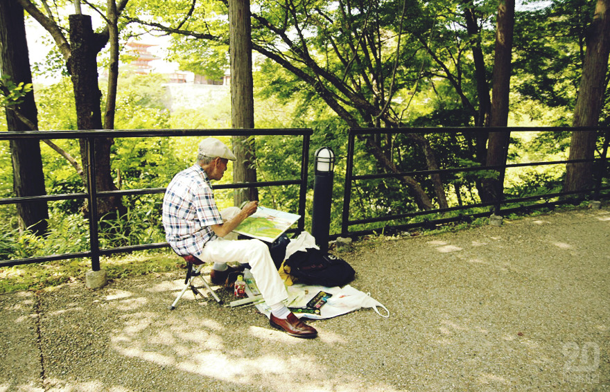 가이드 북에서 봤던 구도로 청수사가 보이는 곳에서 사진을 찍었다. 그래, 이 정도면 기대 이상이라고 만족하며 돌아 섰는데, 그 뒤에서 진짜를 만났다. 베레모를 멋지게 쓰신 화가 할아버지가 그늘에 앉아 청수사를 그리고 계셨던 것이다. 할아버지가 그린 청수사는 모두가 담아가는 ‘그 구도의 청수사’와는 달랐다. 2016년 7월 11일에만 볼 수 있는 청수사. 조금도 뻔하지 않았다. 기대하지 않은 곳에서 마주친 선물같은 장면이었다.