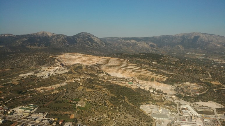 벌거 벗은 대리석산, 이게 그리스 영토의 80%를 차지하는 풍경이다. 계단처럼 깎인 곳은 대리석 채석장이다. 버스를 타면 이런 산들을 타고 넘어 메테오라로 가게 될 것이다.