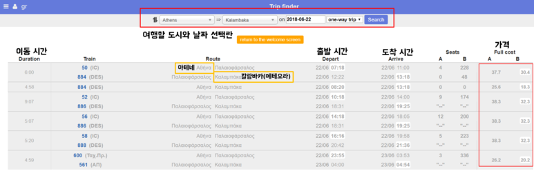 아래 이미지는 위의 사이트로 들어갔을 때 아테네- 메테오라 구간 검색하는 방법!
