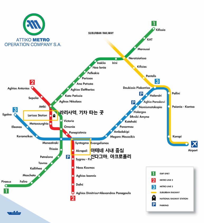 기차역은 위에 노란박스친 라리사역Larissa 으로 가면 된다. 지하철역 밖으로 나가면 바로 옆에 기차역이다. 메인 관광지인 파르테논이나 국회의사당이 있는 아크로폴리, 신다그마역에서 지하철로 10분 거리에 있다. 지하철 티켓은 역 안에 준비된 기계에서 구매하면 되고 1회권이 1.4유로 이다.