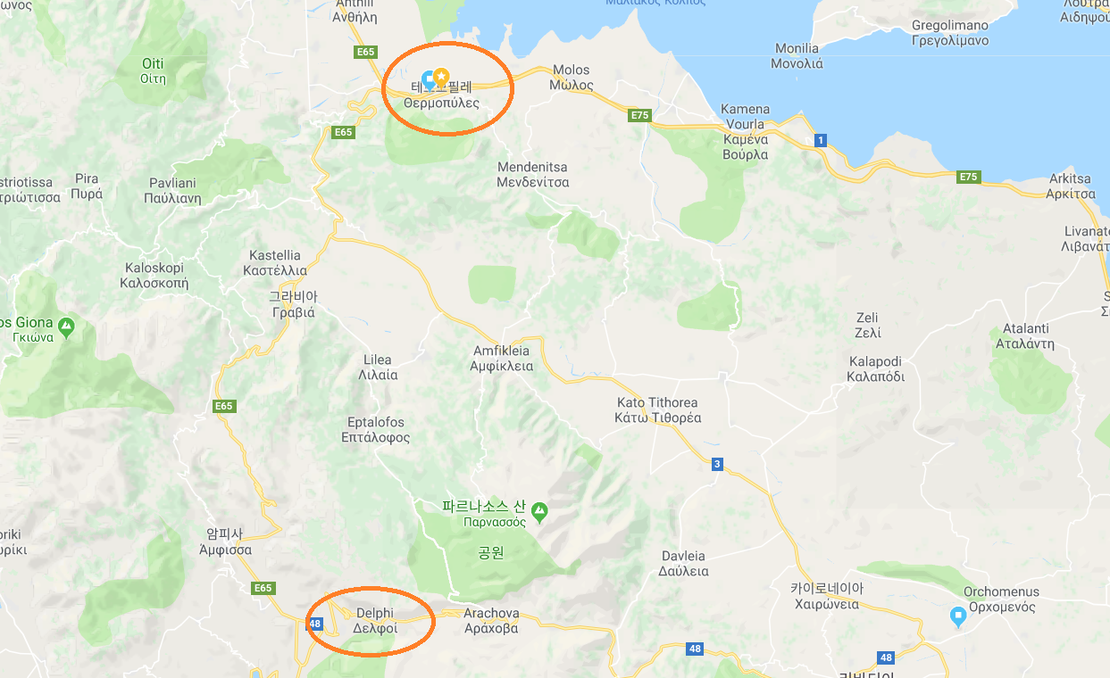 이 지대는 고대부터 유황이 끓었던 곳으로, 진짜 뜨거웠던 곳이라 '열문', 즉 '테르모필레'로 불렸고 여기서 나오던 유황 연기는 델피 아폴로 신탁의 비밀이기도 하다. 자세한 얘기는 다음에 델피에 관해 쓸 때! 지금도 이 곳을 가면 길에 유황 온천이 흐르는 걸 볼 수 있다.