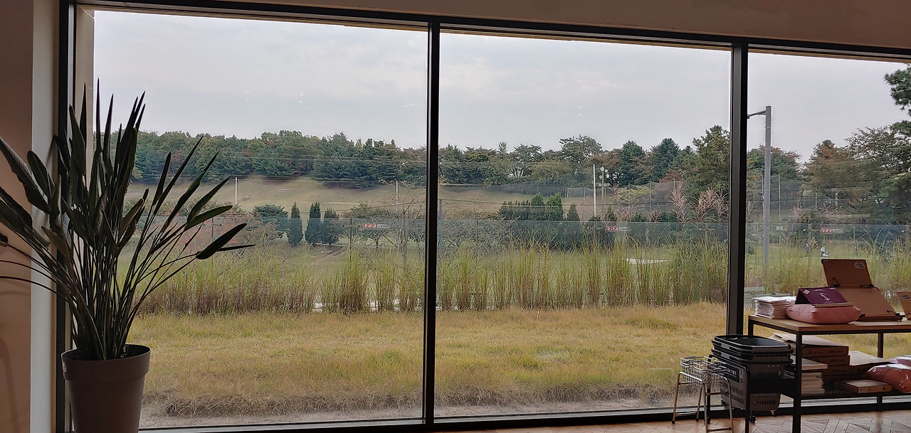 골프장쪽으로 통유리 창을 내놓은 중고서점이