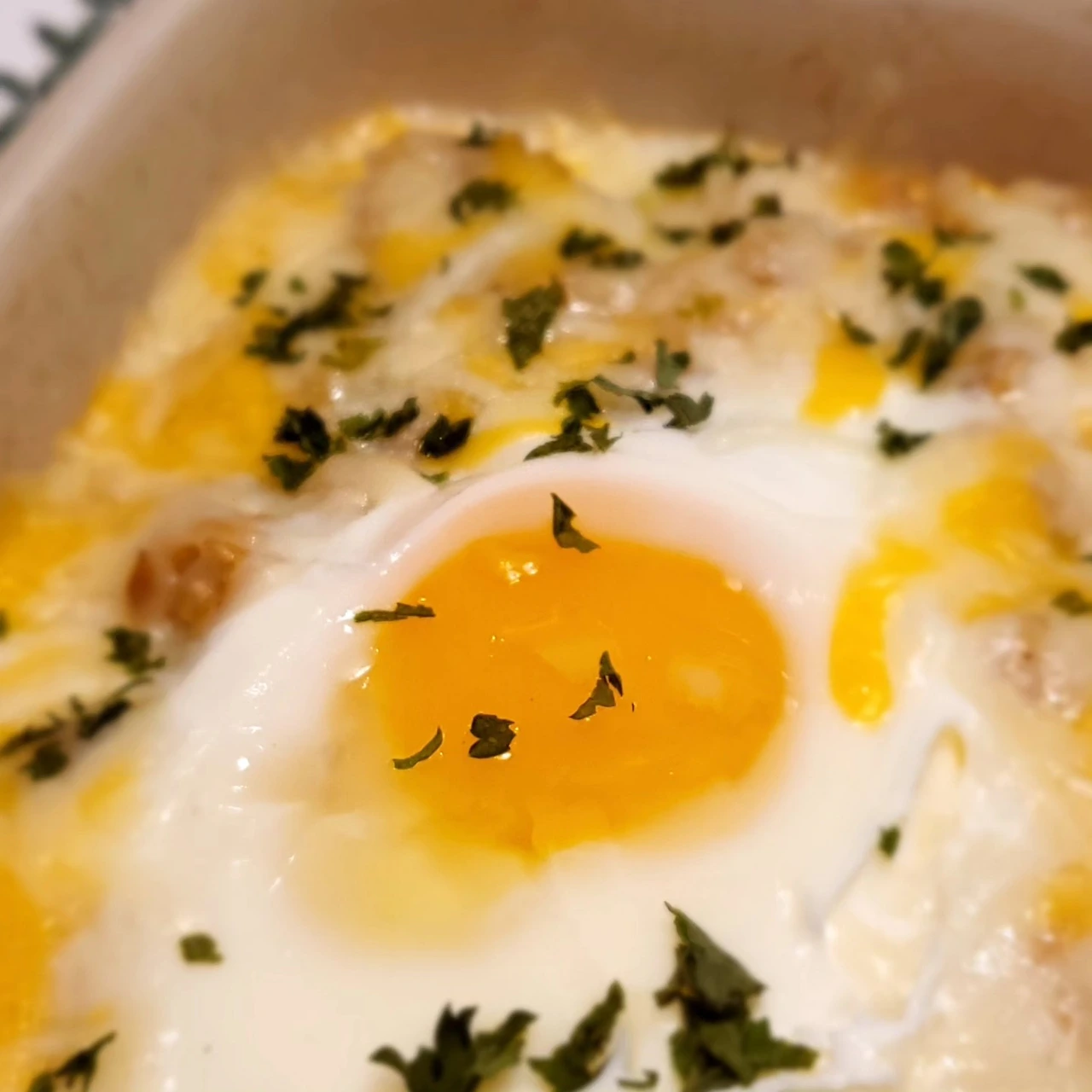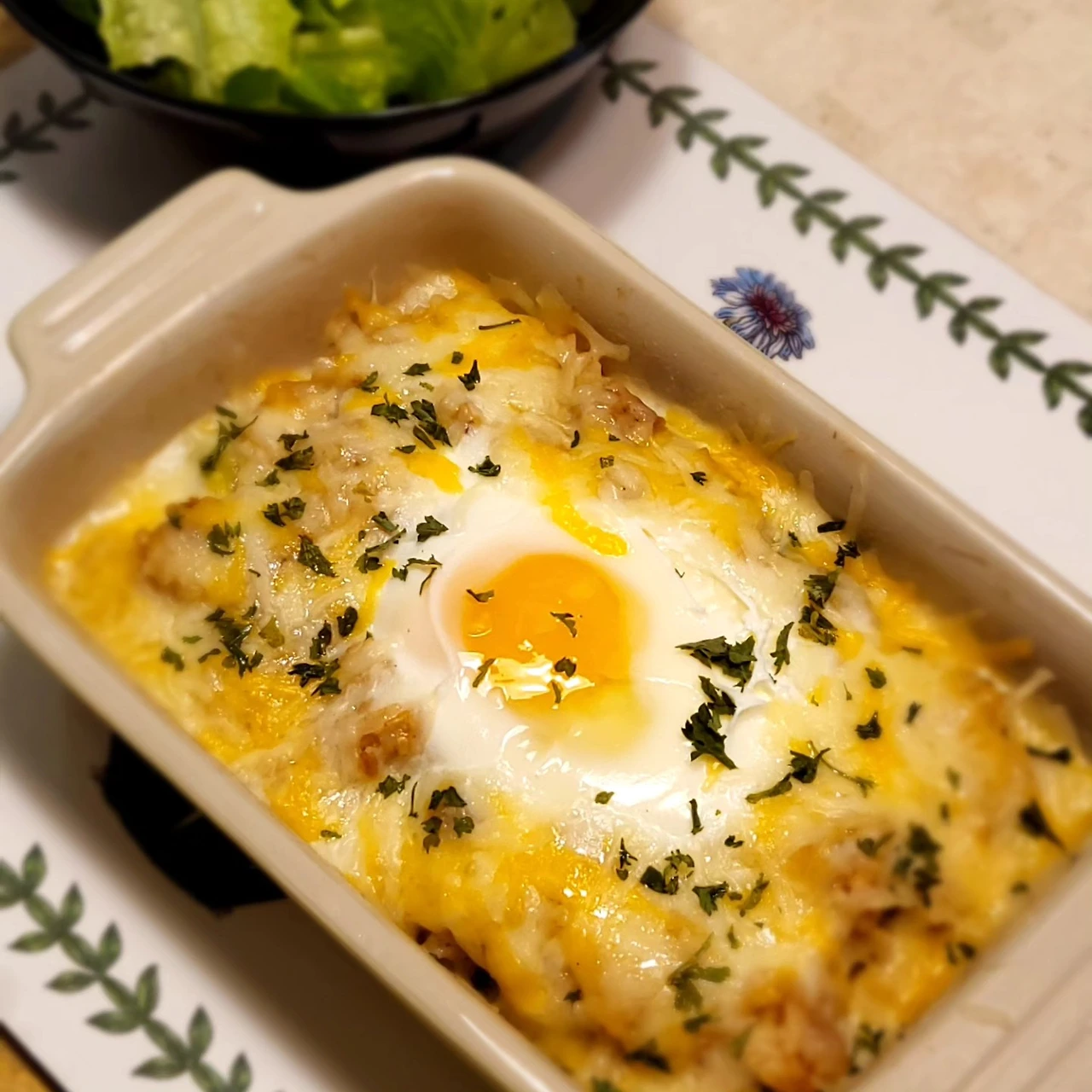 그래서 우선 예쁜 비주얼을 위해 그라땅 용기에 참치 고추장 밥을 담았다. 그리고 그 위에 모짜렐라 치즈를 얹은 다음 가운데에는 계란을 올려 완벽하게 밥을 덮어준 뒤 오븐에 구워 아침 밥상을 차렸다.