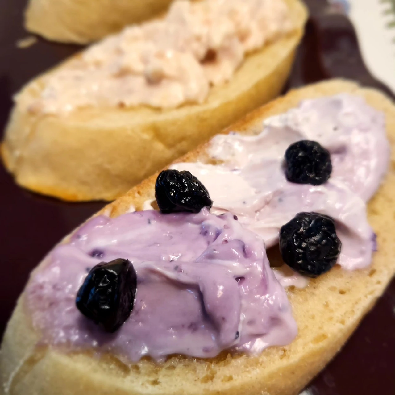 블루베리 크림치즈를 바른 빵 위에는 블루베리나 건블루베리를 얹어주고