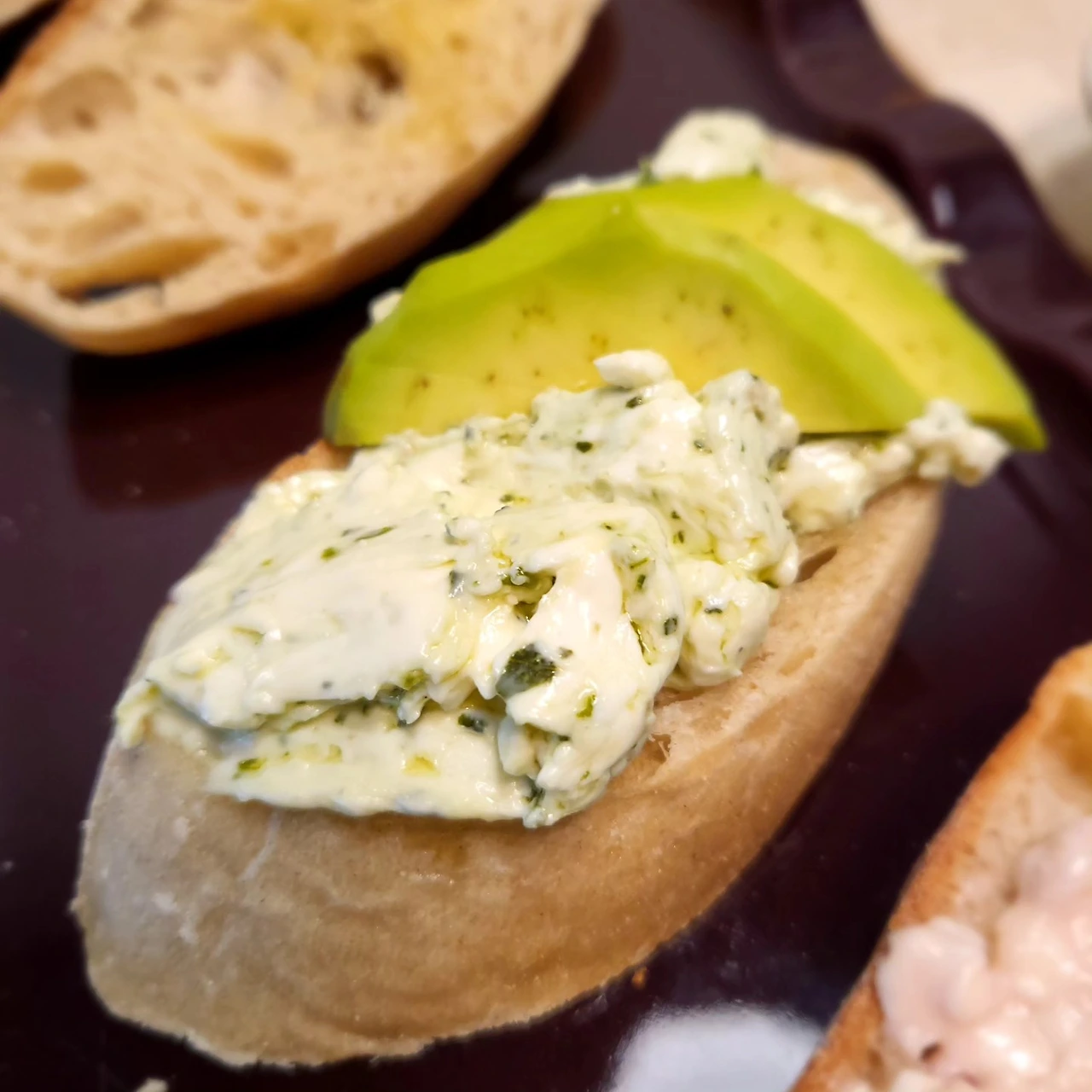바질페스토 크림치즈를 바른 빵 위에는 아보카도를 얹는다.