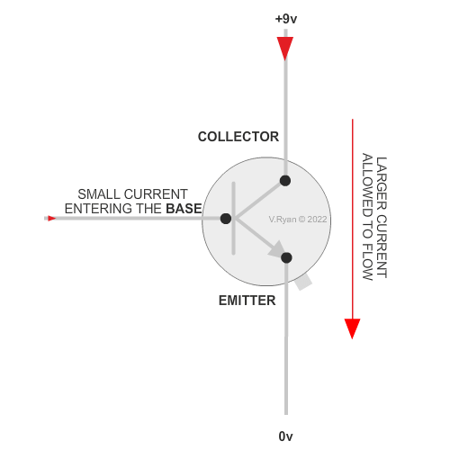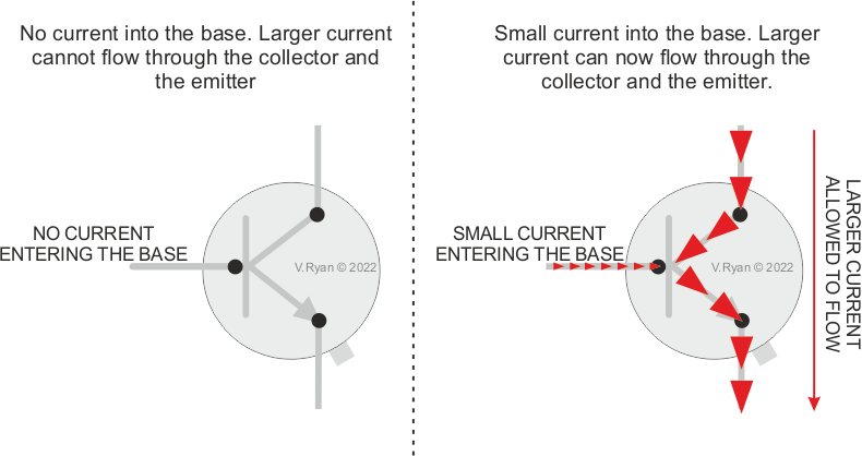 트랜지스터에는 3개의 다리(단자)가 있다. 각각 이미터, 베이스, 컬렉터라고 한다. 트랜지스터는 이들의 상호작용을 통해 전류를 스위칭하거나 증폭한다. 즉 세 개 중 두 개 사이에 전기를 통하게 할지 말지, 어느 정도로 통하게 할지를 나머지 하나의 단자로 조절할 수 있다. 이를 흔히 수도꼭지에서 나오는 물의 양을 밸브의 열린 정도로 조절하는 것에 비유하기도 한다.