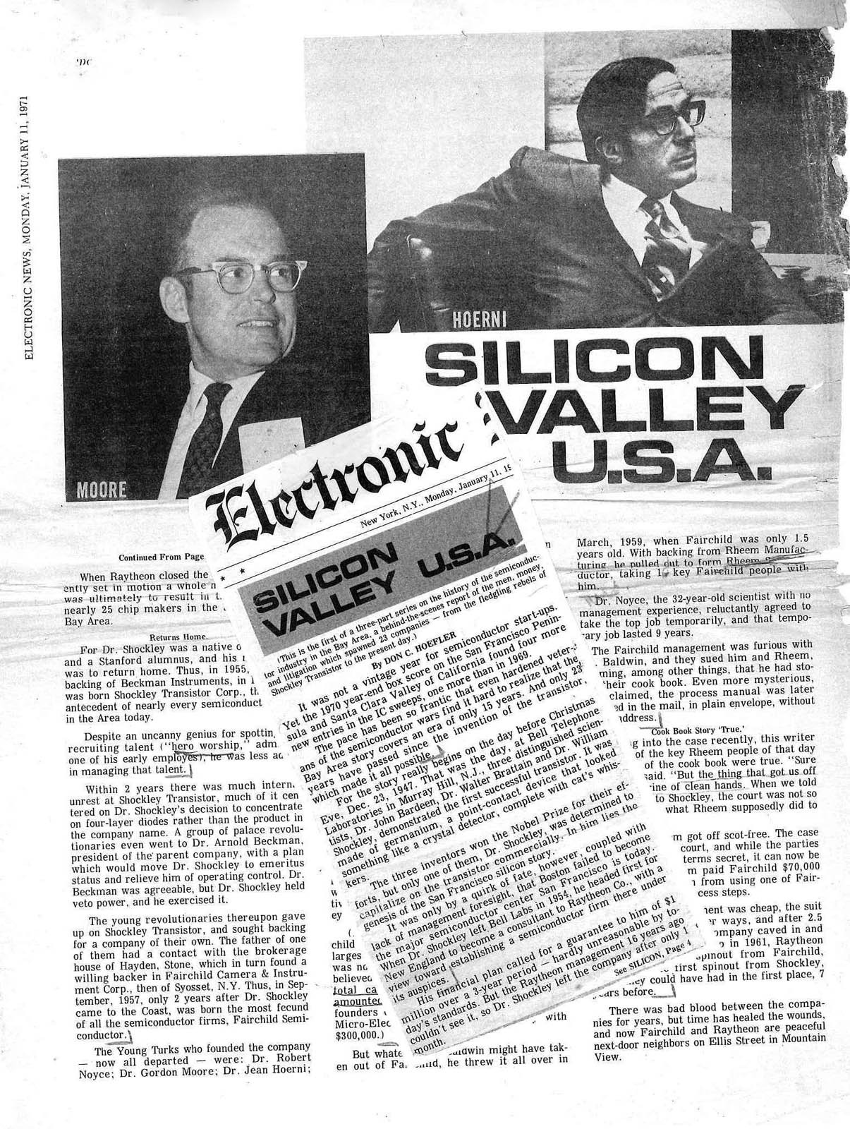 일렉트로닉 뉴스의 1971년 1월 11일 특집 기사. 8인의 배신자들의 활발한 창업을 다뤘다. 이때부터 실리콘밸리라는 용어가 널리 알려지기 시작했다.