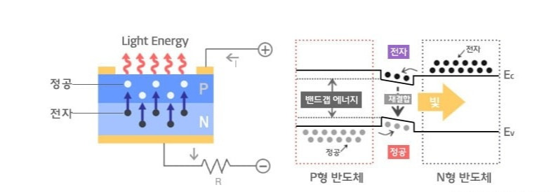 LED는 전기 루미네선스, 즉 전류를 흐르게 해서 빛을 내는 원리를 이용한다. LED라는 이름도 이 원리를 반영한 것이다. 반도체인 두 개(di)의 전극(ode) 사이에 전류를 흐르게 하면, 전기에너지가 발광(light emitting)한다. 두 개의 전극은 양의 성질을 가진 p형 반도체와 음의 성질을 가진 n형 반도체를 붙여서 만든다. 이를 pn 접합이라고 한다. 여기에 전류를 흘러주면 마이너스 전하를 운반하는 전자가 이동하여 플러스 전하를 운반하는 정공과 결합한다. 그러면서 나오는 전기에너지가 빛의 형태로 발광하는 것이다. 이때 반도체에 사용하는 원소를 다르게 하면 방출되는 에너지의 양도 달라진다. 바로 이 에너지 크기의 차이에 따라 빛의 파장 길이가 결정되고 다른 색을 낼 수 있게 된다.