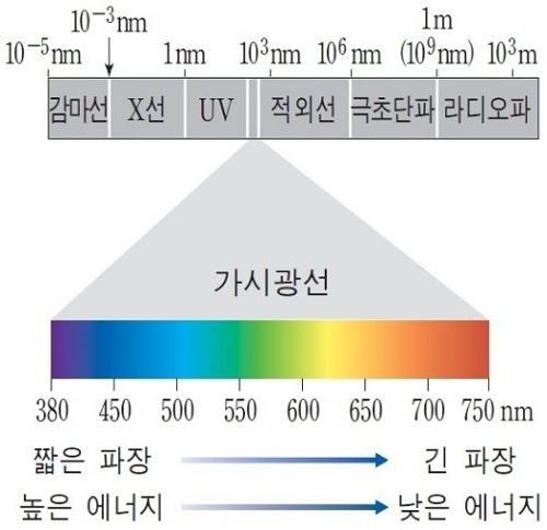 전자기파로서 빛은 고유의 파장대를 가지고 있다. 길이에 따라 나누면, 전파/마이크로파/적외선/가시광선(빨주노초파남보)/자외선/X선/감마선이 된다. 즉 전파에서 감마선으로 갈수록 파장은 짧아지고 방출하는 에너지는 커진다. 이중 시각적으로 인지할 수 있는 파장대가 가시광선이다. 가시광선에서는 적외선에 가까운 빨간색의 파장이 길고, 자외선에 가까운 보라색으로 갈수록 파장이 짧고 에너지가 커진다.