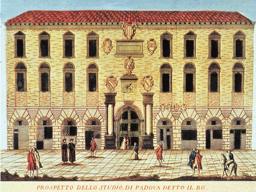 이탈리아 파도바대학교의 근대 초기 모습(위쪽)과 현대(아래쪽). 파도바는 르네상스 운동의 지적 거점이었다. 코페르니쿠스, 갈릴레이, 베살리우스 등 석학들이 이곳에서 연구했다.