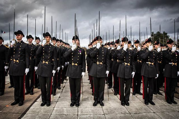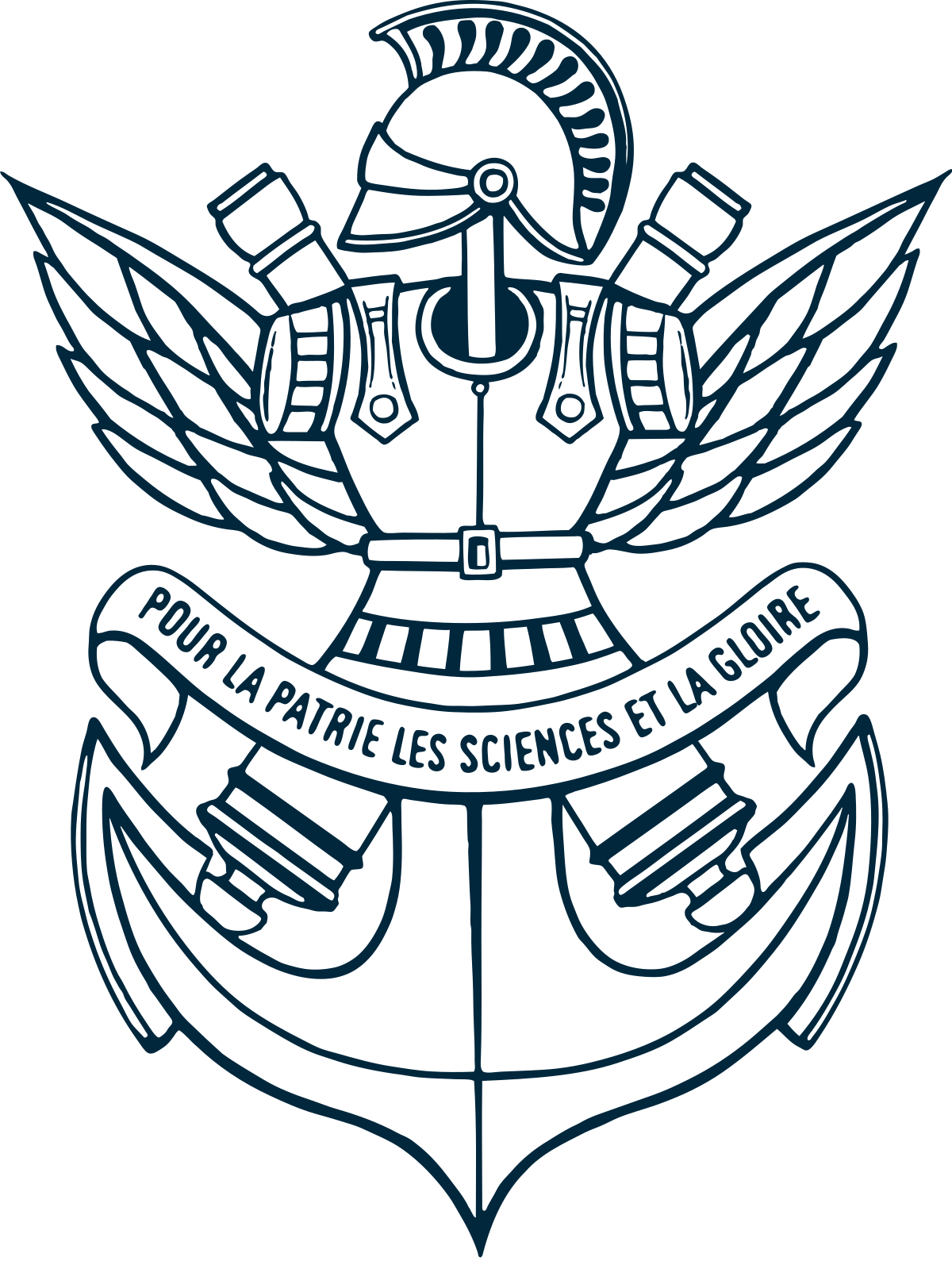 에콜 폴리테크니크 문장(왼쪽)과 재학생들(오른쪽). ‘조국, 과학, 그리고 영광을 위하여(Pour la Patrie, les Sciences et la Gloire)'