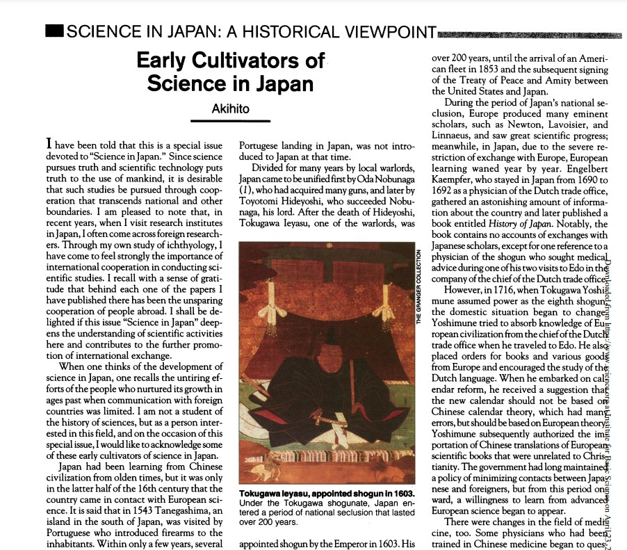 1992년 아키히토 천황이 <사이언스>에 투고한 논문. 저자명에 'Akihito, His Majesty the Emperor of Japan'이라고 표기되어 있다.
