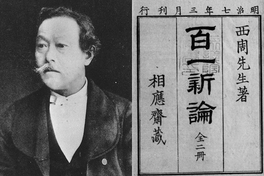 니시 아마네(왼쪽)와 그의 1874년 저서 『백일신론』(오른쪽). 이 책에서 니시는 서양의 philosophy를 '철학'으로 번역한다.