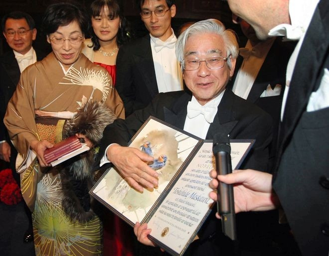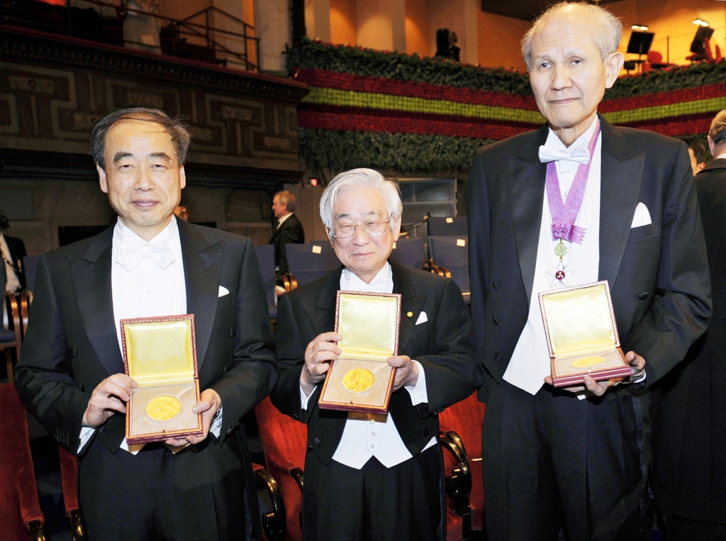 2008년 노벨물리학상을 수상한 고바야시 마코토, 마스카와 도시히데, 난부 요이치로(왼쪽부터). 일본인들로만 노벨상을 받은 것은 이 때가 처음이었다.