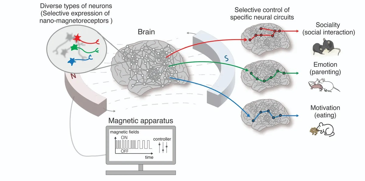 덕분에 머리에 어떤 장치를 꽂지 않아도, 외부 자기장만으로 뇌 속 깊은 곳의 신경세포를 자유롭게 켜고 끌 수 있게 되었습니다. 연구진은 동물실험을 통해 Nano-MIND 기술로 뇌신경회로가 만들어내는 사회성, 모성애, 식욕 등의 뇌 기능을 자석으로 스위치 켜듯 조절할 수 있음을 보였습니다. 따라서 향후 뇌질환 치료나 뇌-기계 인터페이스 개발에도 응용될 수 있는 잠재력을 입증했습니다.