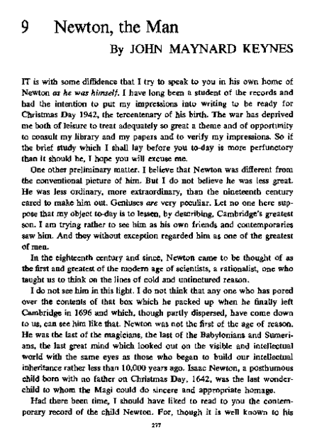 이 원고를 통해 놀라운 사실이 알려졌다. 뉴턴이 물리학과 수학뿐만 아니라 연금술과 신학에도 심취했다는 것이다. 물론 뉴턴이 신학과 화학 - 당시에는 연금술로 불렸다 - 에 관심이 많았음은 알려져 있었다. 다만 그 수준이 어느 정도인지, 또 그게 그의 과학 연구와 어떤 관련이 있는지는 오랜 수수께끼였다. 케인스는 자신이 모은 방대한 문헌들을 분석한 끝에, 그가 평생 수학·물리학보다 연금술과 신학 연구에 훨씬 더 많은 시간을 쏟았다는 결론을 내렸다. 실제로 뉴턴의 미완성 원고는 무려 100만 단어가 넘었는데, 대부분이 신비주의에 대한 것이었다.