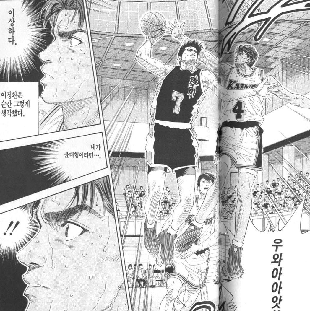 그런데 이노우에는 끝내 이 조합을 등장시키지 않았다. 작중 정우성과 신현철은 각자의 포지션에서만 압도적인 모습을 보인다. 정우성은 서태웅을 쳐바르고, 신현철은 채치수를 가지고 논다. 둘이 각각 1대1로 상대를 부수는 장면은 있어도, 서로의 움직임이 연결되는 장면은 거의 없다.