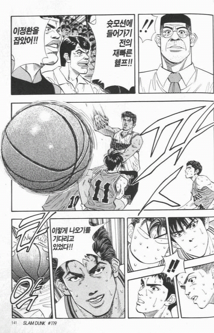 그러나 후반 들어 이들은 ‘팀으로서의 공격’을 완성했다. 정성우를 알아본 서태웅은 돌파를 억제하고 패스로 방향을 바꿨다. 가자미 모드가 된 채치수는 적극적으로 스크린을 걸며 팀플레이의 축이 되었다. 그 결과 정대만이 스크린을 타고 연속 3점을 성공시켰고, 채치수가 서태웅의 패스를 받으며 골밑 공격력도 살아났다. 패스 옵션을 추가한 서태웅이 정우성에게 득점을 따낸 건 덤이다. 요컨대 산왕전은 북산의 삼각 편대가 개별 재능의 조합을 넘어, 전술적 유기체로 진화하는 과정을 보여준 무대였다.