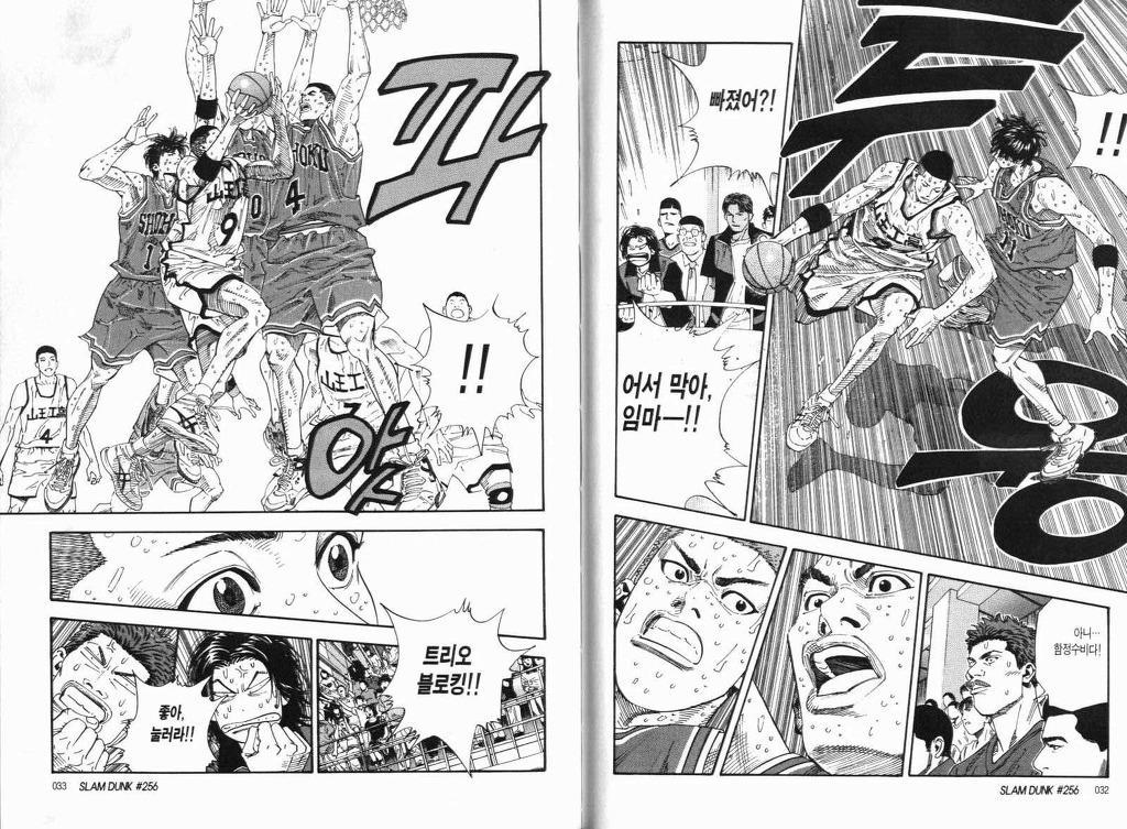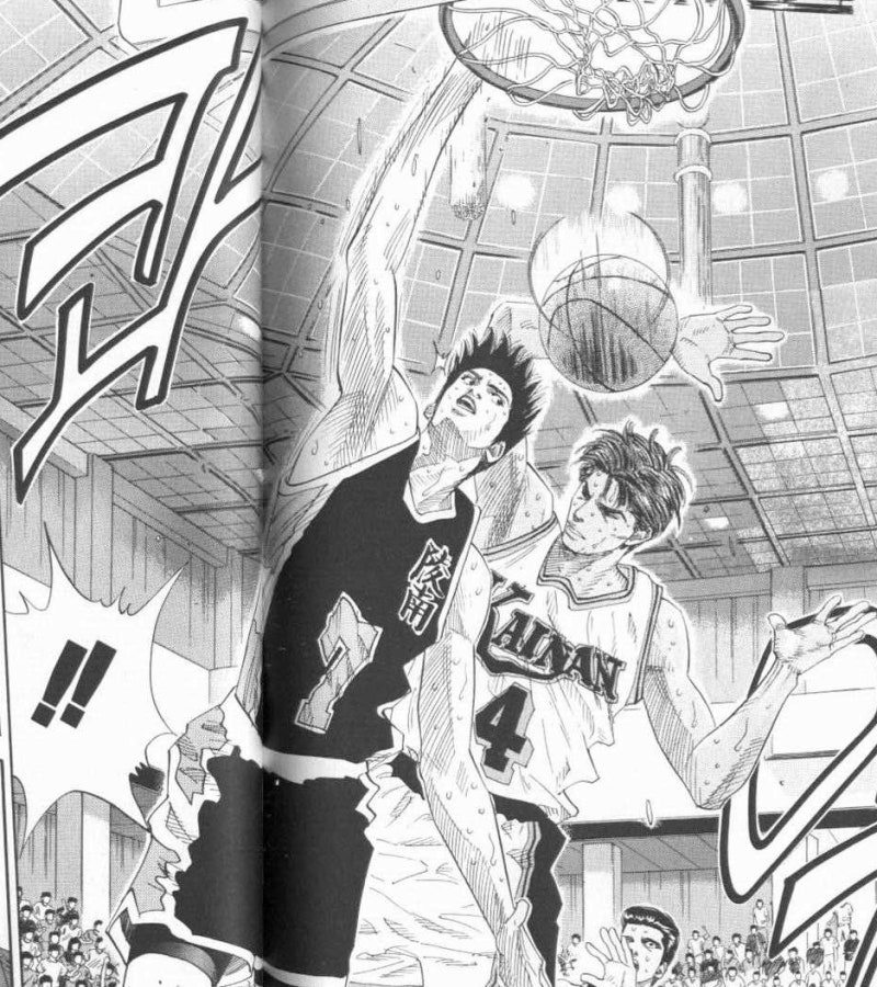 특히 마지막 산왕전은 이 조합의 진화가 정점에 오른 경기였다. 초반에는 개인 능력에서 몇 수 위인 산왕의 벽에 부딪혔다. 채치수는 스트레치 빅맨 신현철에게 끌려 나오면서 골밑 장악력을 잃었다. 서태웅은 에이스로서 정우성에게 모든 면에서 밀렸다. 정대만은 초반 3점슛으로 분위기를 이끌었지만, 오버페이스로 체력이 급격히 떨어졌다.