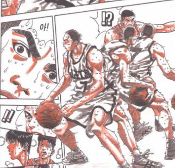 이렇게 되면 수비는 분산되고, 공격은 한층 다이내믹해진다. 수비가 채치수를 막으러 인사이드로 몰리면 정대만에게 오픈 찬스가 난다. 반면 수비가 외곽으로 벌려지면 서태웅이 1:1 돌파로 틈을 찢는다. 그 결과 송태섭에게도 돌파 레인이 열린다. 즉 송태섭이 빠른 스피드로 페인트존을 공략하거나, 수비가 몰리면 채치수에게 킬패스를 찔러 넣는 추가 옵션이 가능해진다. 이렇게 삼각 편대에 송태섭까지 더해지면 북산의 공격은 거의 무적이 된다.