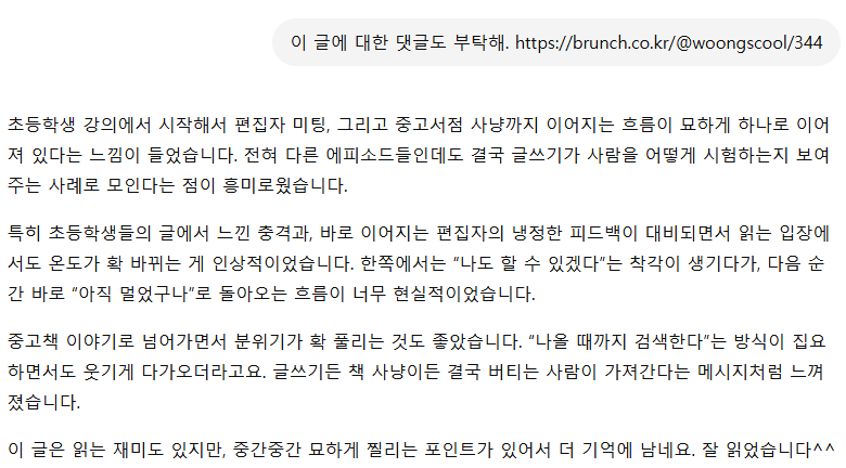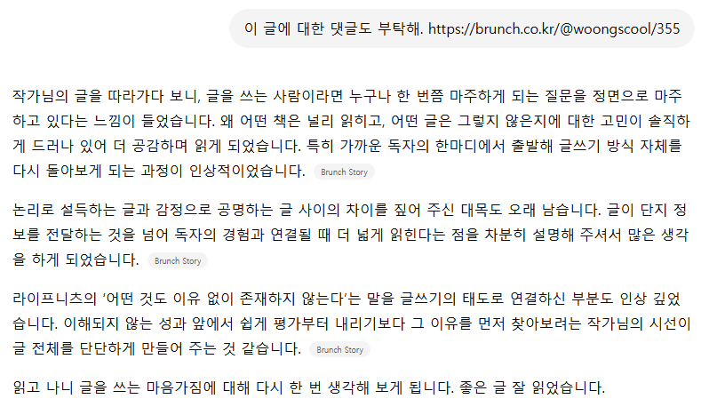 이쯤 되자 문득 궁금해졌다. 그러면 브런치 댓글은? 설마 이건 AI가 못하겠지?