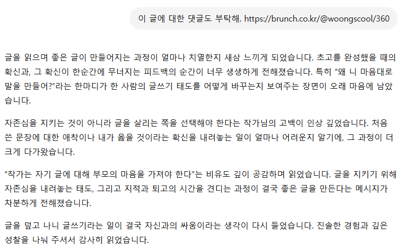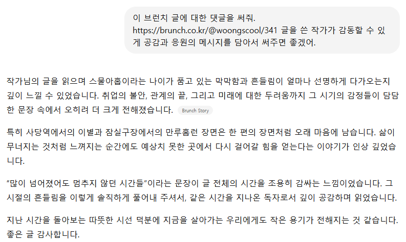 그래서 실험해 봤다. AI에게 내 브런치 글 몇 개 던져주고 “작가가 감동의 폭풍 눈물을 흘리게 댓글 달아줘”라고 시켜보았다.